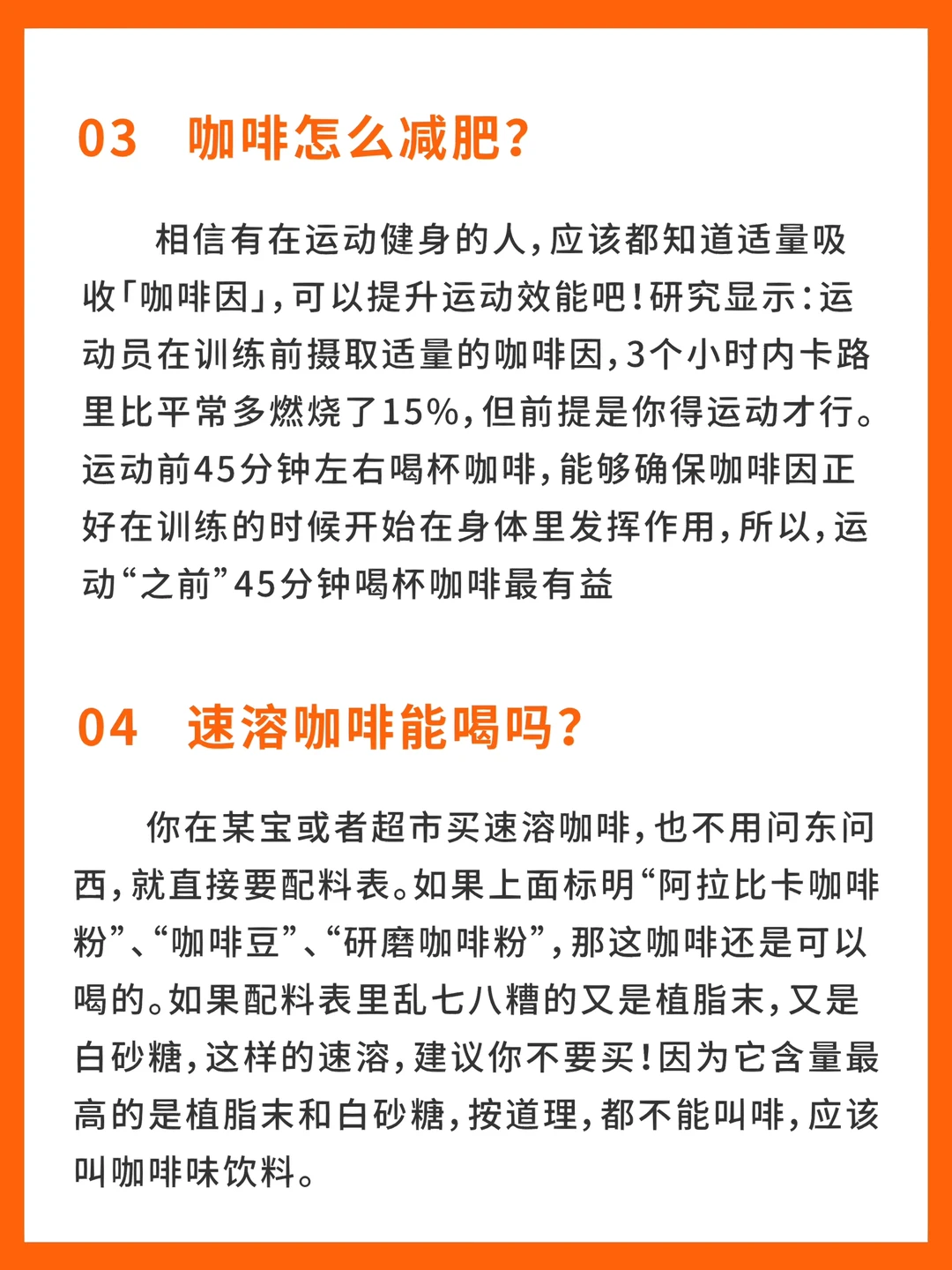 🔹相信有在运动健身的人,应该都知道适量吸收T咖啡因J,可以提升运动效能吧!研究显示:运动员在训练前摄取适量的咖啡因,3个小时内卡路里比平常多燃烧了15%,但前提是你得运动才行运动前45分钟左右喝杯咖啡,能够确保咖啡因正好在训练的时候开始在身体里发挥作用,所以,运动“之前”45分钟喝杯咖啡最有益