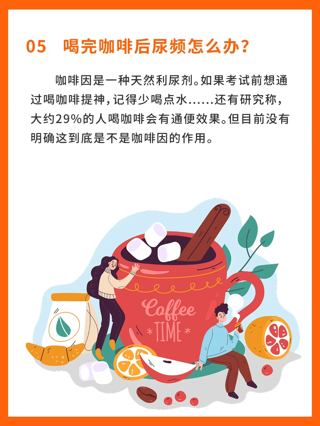 咖啡因是一种天然利尿剂。如果考试前想通过喝咖啡提神,记得少喝点水......还有研究称,大约29%的人喝咖啡会有通便效果。但目前没有明确这到底是不是咖啡因的作用。