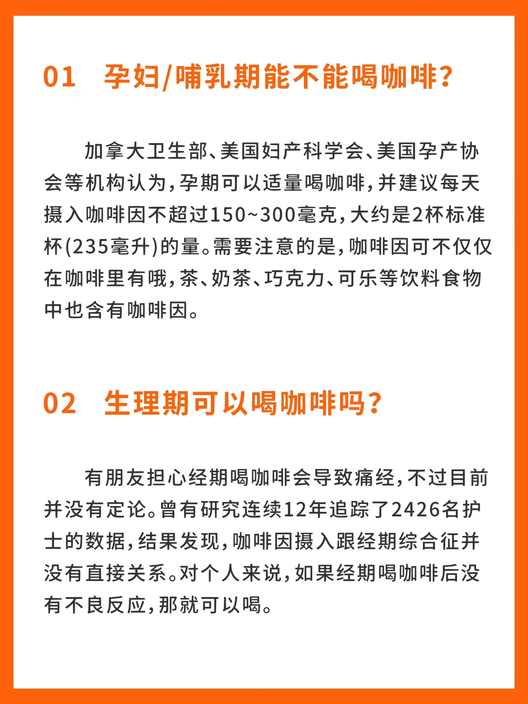 有朋友担心经期喝咖啡会导致痛经,不过目前并没有定论。曾有研究连续12年追踪了2426名护士的数据,结果发现,咖啡因摄入跟经期综合征并没有直接关系。对个人来说,如果经期喝咖啡后没有不良反应,那就可以喝。