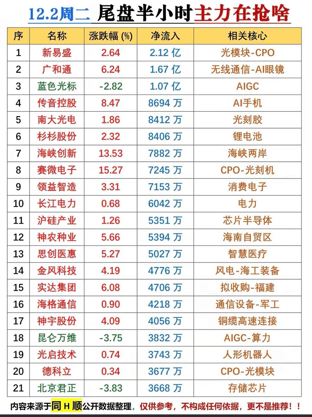 12.02周二 尾盘半小时 主力抢筹前20!尾盘资金抢筹,主要集中在军工装备,ai手机,通信设备,存储芯片,福建海南,CPO光模块等。有的是主力左右手倒卖,日内做低差价,降低持仓成本。