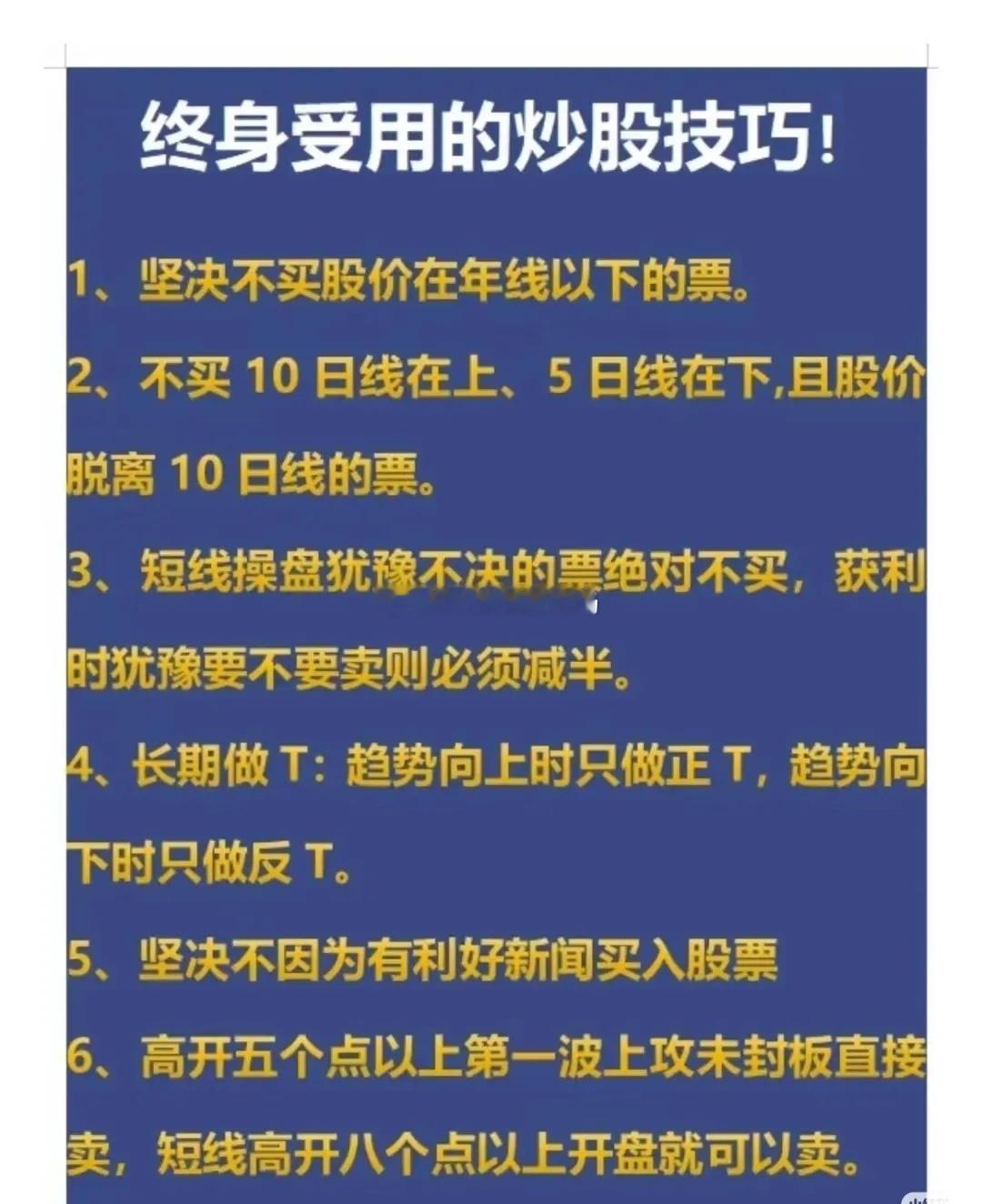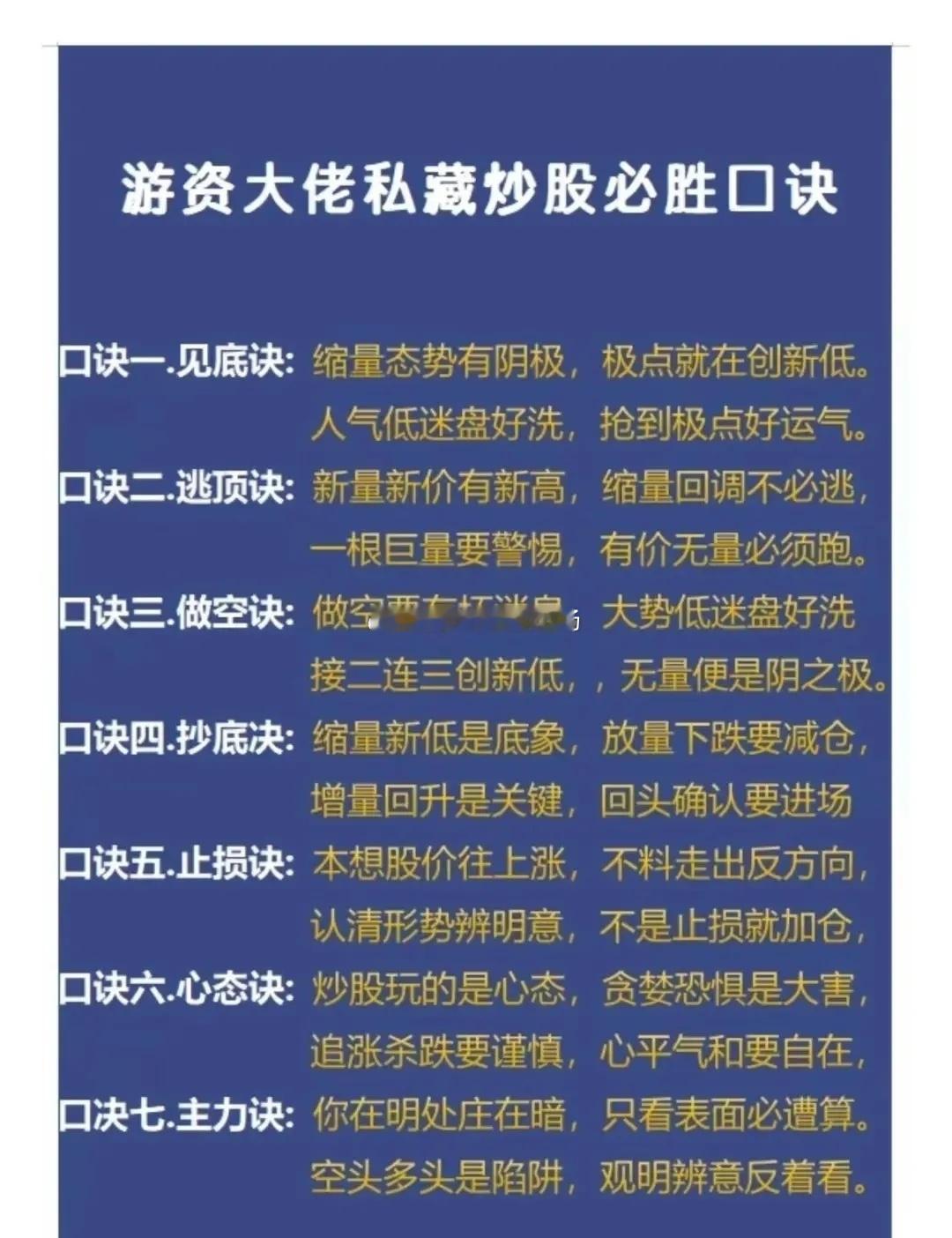 这些内容围绕炒股经验、技巧与策略展开,涵盖多方面实用要点。首先是炒股养家16年的19条心得,涉及仓位管理(如大赚后空仓、连亏3天果断卖出)、买卖时机(熊市买尾盘、牛市买早盘)、市场趋势(趋势形成不易改、只做上升趋势)、成交量解读(天量预示变盘、低位放巨量有行情)、消息面应对(利好反着看、利空当利好)、选股策略(聚焦三支标的、炒新不炒旧)等,强调交易需有计划,学会空仓等待机会。关于“交易玄学”,指出买卖股票要保密,不向身边人提及,因财运各异,投资应独立私密进行,闷声更易发大财。炒股的本质被总结为“等关键点”:上涨后等回调,回调后等支撑,支撑后等进场,进场后等冲高,耐心领悟可简化炒股逻辑。“终身受用的炒股技巧”给出六条具体建议:不买年线以下、10日线在上且股价偏离10日线的股票;不买短线操作犹豫的票(获利犹豫则减半卖);长期做T遵循趋势向上做正T、向下做反T;不因利好买入;高开5%以上第一波未封板即卖,短线高开8%以上开盘可卖。15年炒股经验强调几点关键做法及效果:不追高赢50%的人,只做向上趋势赢70%的人,回调入场超越90%的人,控制单票持仓上限并做好资金管理超越98%的人,坚持可趋近财富自由。游资大佬私藏的炒股必胜口诀涵盖见底、逃顶、做空、抄底、止损、心态、主力七方面,如见底诀“缩量态势有阴极,极点就在创新低”,逃顶诀“一根巨量要警惕,有价无量必须跑”,提醒关注量价关系与主力动向,保持良好心态。“炒股顺势而为”的口诀结合季节、事件与市场规律,如“冬炒煤来夏炒电,五一十一旅游见”“通胀保值就买地”“重组向来都无敌”“牛市买入大蓝筹,弱市玩ST”等,提供贴合场景的操作参考。均线实战核心技巧则聚焦5日、20日、60日均线运用:站5日均线以上不轻易卖,60日均线以下不值得买;上升趋势中回调到5日均线是买点,回踩20日均线有支撑,5日均线上穿10日均线可加仓,助快速通过均线判断买卖时机。这些内容从底层逻辑到具体操作,从心态把控到技术指标运用,为炒股提供了多维度的经验指引。