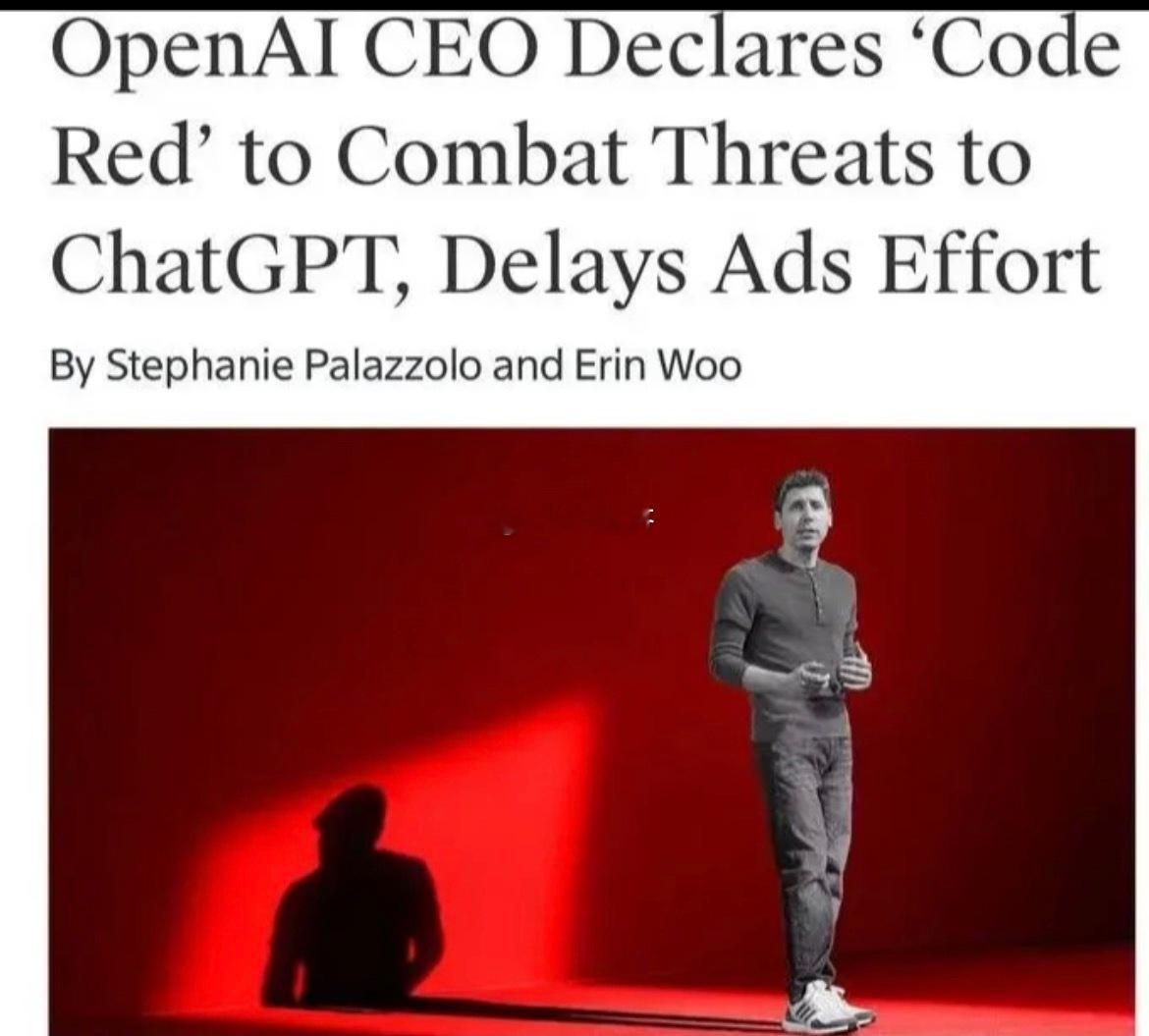 OpenAI首席执行官宣布启动“红色警报”以应对ChatGPT面临的威胁,并推迟广告投放计划。