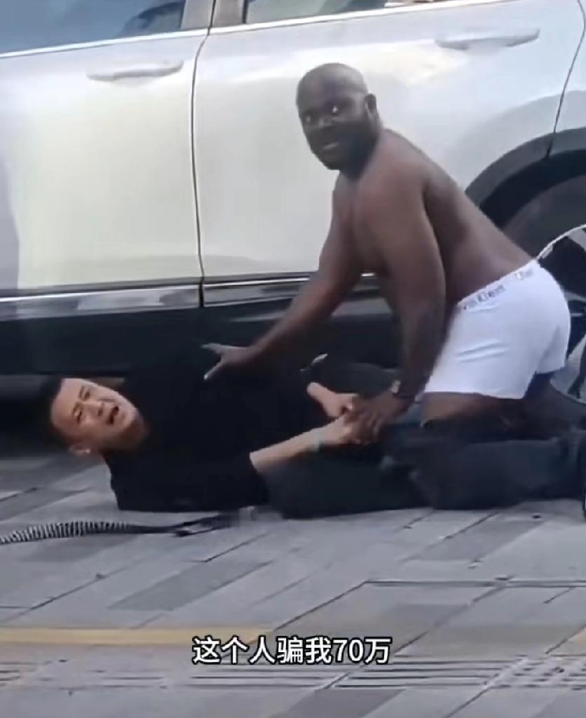 大街上的一幕:黑衣男子拖住黑人男子,大喊着“兄弟们帮我抓一下,这个人骗了我70万”。过往路人竟然没有一人想着上去帮忙…… 网友评论: 什么脑子?在国内都能被黑人骗七十万,谁知道是什么情况,多一事不如少一事! 该说不说,看到自己的同胞被黑人欺负了,怎么也要出手帮一帮吧,现在国人怎么都如此冷漠了呢! 大家觉得呢?
