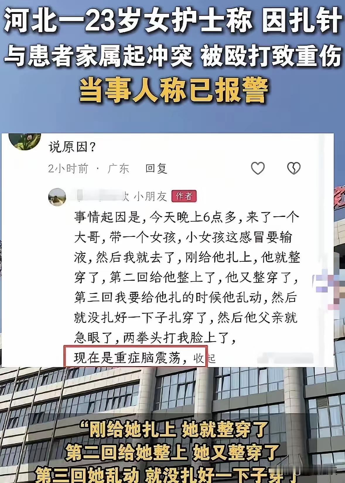 这起事件中的护士小林在面对孩子的紧张与不配合时,展现了极大的耐心和专业精神。她试图通过温和的安抚来缓解孩子的恐惧,反复尝试完成打针工作,表现出职业操守。然而,令人痛心的是,由于家长情绪失控,竟然对小林进行了暴力攻击,造成严重身伤,这不仅严重违反了法律,也违背了基本的社会伦理。 从法律角度来看,男子的行为已经触犯了《刑法》第234条的故意伤害罪,男子用拳头击打护士,导致其重度脑震荡、骨裂、耳出血、下巴脱臼等严重伤害,依法应承担相应的刑事责任。同时,按照《民法典》第1179条的规定,他还需承担相应的民事赔偿责任,包括医疗费、误工费等各项费用。 从社会责任和职业道德角度,作为家长,理应保持理智和冷静,理解医护人员的工作难度,尊重医务人员的辛勤工作。情绪激动、失控甚至动手打人,不仅伤害了医务工作者,也可能对孩子产生长远的不良影响。孩子在如此场景中目睹父亲的暴力行为,可能会产生恐惧、疑问,甚至心理阴影。 此外,这件事也提醒我们:遇到矛盾和压力,沟通应始终通过合理、合法的途径解决。冲动和暴力只会带来更严重的后果,不仅危害他人,也可能让自己付出更高的代价。 公众应当共同反思,尊重医务工作者的职业价值和付出,遵守法律法规,理性应对各种突发情况。只有通过和平、理性的方式解决问题,才能营造一个安全、和谐的社会环境。 对于护士小林而言,她值得社会的理解和支持,也需要法律的公正裁决来惩治肇事者,保障其合法权益不受侵犯。 你怎么看待这件事呢?打针的小护士 打针事故