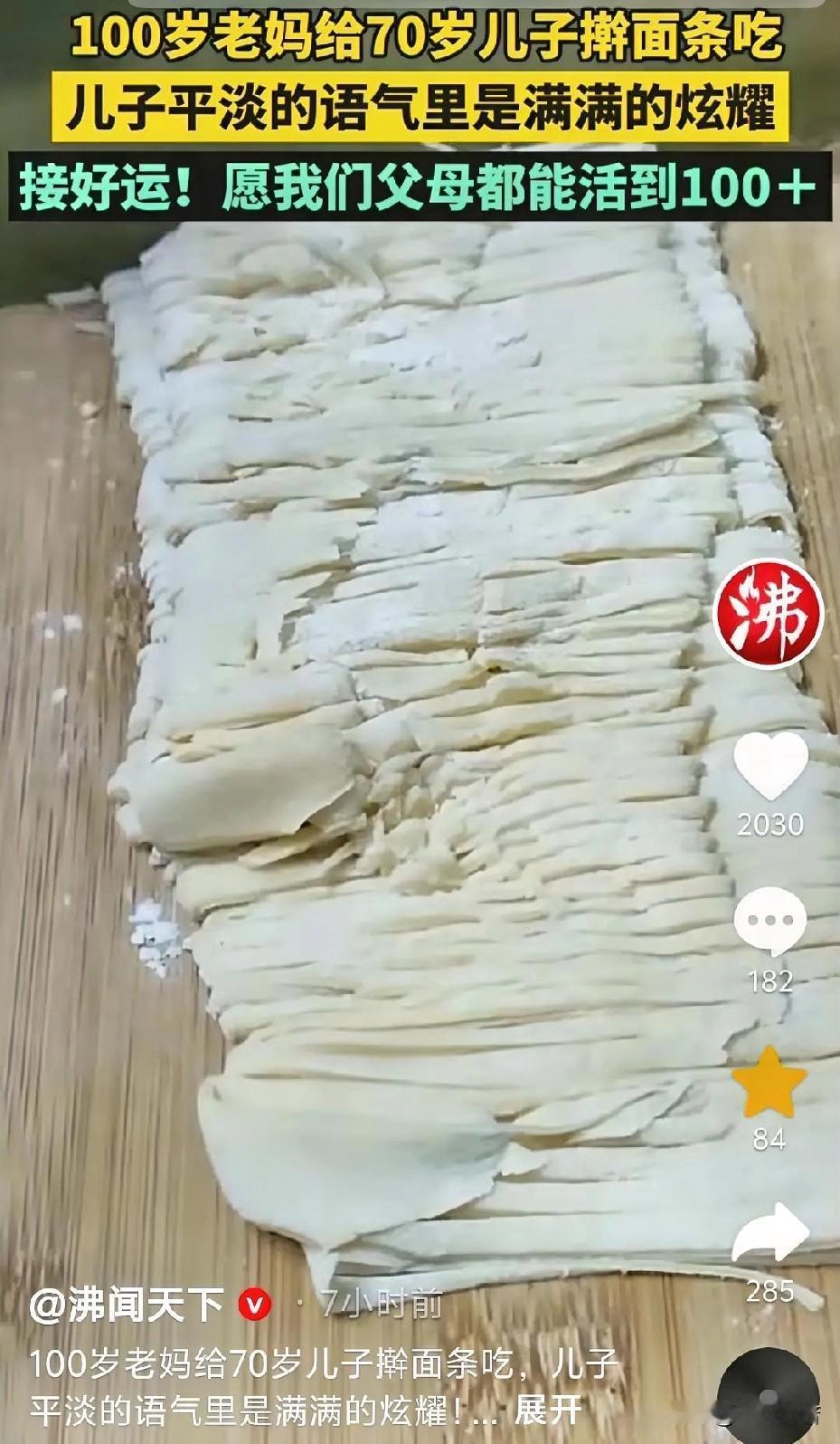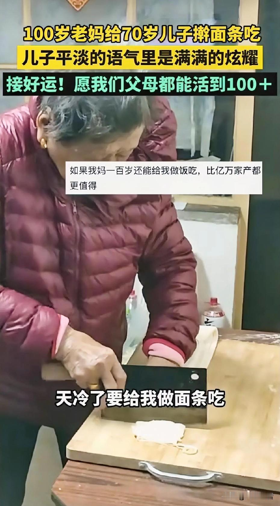 近日,北京,一名70岁的大爷刚进家门,就看见100岁的母亲正站在案板前擀面条。母亲的双手布满了岁月刻下的皱纹,指节虽有些僵硬,动作却依旧娴熟。 大爷站在一旁静静地看着,灯光落在母亲花白的发间,镀上一层温暖的光晕。这寻常的晚间,因母亲忙碌的身影满是踏实的暖意。 母亲擀面条的手艺传了一辈子,即便年岁已高,也总记挂着儿子爱吃的炸酱面。面皮切得宽窄均匀,下锅煮至浮起,捞入碗中浇上提前煎好的炸酱,酱香混着面香萦绕鼻尖。 岁月匆匆,转眼母亲已度过百年光阴,可她对儿子的疼爱从未减淡,依旧愿意为儿子制作满含母爱的面条。原来最珍贵的幸福,不过是百岁老妈在侧,一碗热面飘香,岁岁平安,日日温暖。 大爷表示,看我100岁的老妈,天冷了要给我做面条吃,我都没有这刀工,切的倍儿细,你这哪像100岁的老人。接好运,愿我们的父母都能活100多。 看了视频,百岁老妈亲手擀面条制作炸酱面,这事儿听着就暖到心里,藏着最简单的幸福。这份疼爱从未因年纪变浅,百岁老人或许手脚不利索了,却还记着孩子爱吃啥,愿意花心思动手做,这份刻在骨子里的牵挂,比啥都珍贵,是细水长流的暖心。 烟火气里的幸福最踏实,没有山珍海味,就是一碗家常热面,可这面里裹着老妈的心意,看着老人忙碌的身影,吃着熟悉的味道,心里满是安稳,其实过日子就是图的这份简单的陪伴和牵挂,平淡却最让人安心。 这份画面特别难得,百岁高龄还能为孩子做饭,既是老人身体硬朗的福气,也是晚辈的幸运,这样的日常片段,藏着最真的亲情,越普通越让人动容,平凡日子里的这份温暖,就是最珍贵的小幸福。(来源:沸闻天下)
