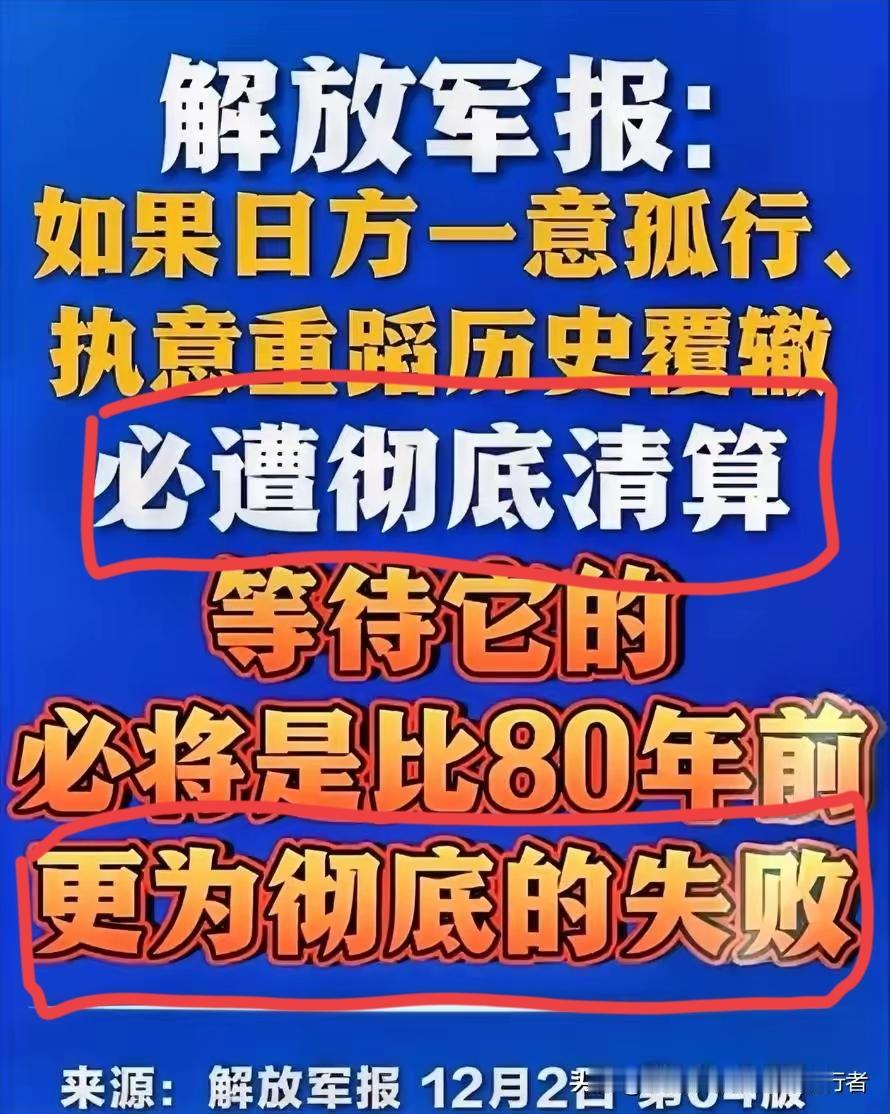 12月2日解放军报:“如果日方一意孤行,执意重蹈历史覆辙,必遭彻底清算,等待它的必将是比80年前更为彻底的失败!” 这段话分两个层面: 第一层是历史的清算,如果“日本重蹈历史覆辙,必遭彻底清算”。这应该被理解为,只要日本“重蹈历史覆辙”,我方已做好甚至已经迫不及待地要对日本在侵华战争中犯下的滔天罪行进行包括但不限于迫使其承认战争罪行、认罪和战争赔款的彻底清算。要做到这一点,绝不是简单地在日本本土之外的某个地方或某个海域进行一次短暂的冲突就可以做到的。所以,解放军报的这句话绝对称得上是对日本的郑重承诺,而中国人恰恰是说到做到的民族。 第二层是战争胜负的清算。日本一直不承认战败,尤其不承认战败于中国。那么好吧,日本可以重蹈覆辙,那“等待日本的必将是比80年前更为彻底的失败”,也即要让日本输的心服口。还是那话,中国人是说到做到的民族。 解放军报话已至此,重与不重就看日本人是嫌自己命长还是命短啦!
