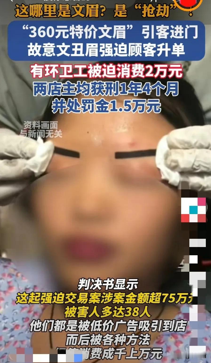 “不要999,也不要666,只要360,给你原生美眉的自信”,这价格换谁都招架不住。近日纹眉风波终于告了一个段落。 很多人冲着几百块的“纹眉”项目,销售的三寸不烂之舌,再加上炙诚的热情,软磨硬施的拉扯,果然不少爱美女士上当受骗,上至学生,宝妈,打工人,下到连环卫工人的辛苦钱都要骗,实在太不道德了。 消费者冲着活动的噱头进店,指明纹个广告上的眉毛,店员却故意做成“张飞眉”,或者只纹个一边,迫使顾客加钱才继续。以此广告过来纹眉的受害者多达38人,涉案金额75万,平均一个人被骗2万左右。 从几百块到几万的悬殊,实在太差强人意,好在相关人员已被抓捕归案,判处一年4个月,罚款1万5,并且返还受害者全部骗款,真是得不偿失啊,出来混的迟早要还回去。 虽然爱美之心人皆有之,但是君子取财有道,做人还是得有良心啊,大家有在美容院遇到类似的坑商家吗? (图片来自网络视频)