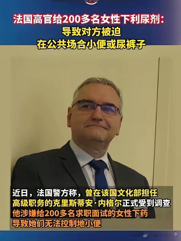 法国文化部的高官怎么说也是一个文化人了吧!但是这个文化人可是又坏又变态。涉嫌给到法国文化部应聘的200多名女性下利尿剂,导致这些妇女无法控制小便,在公共场合小便或者尿裤子。难道他喜欢看女人尿裤子或者是喜欢闻女人的尿骚味儿?真不知道这些死变态怎么想的。