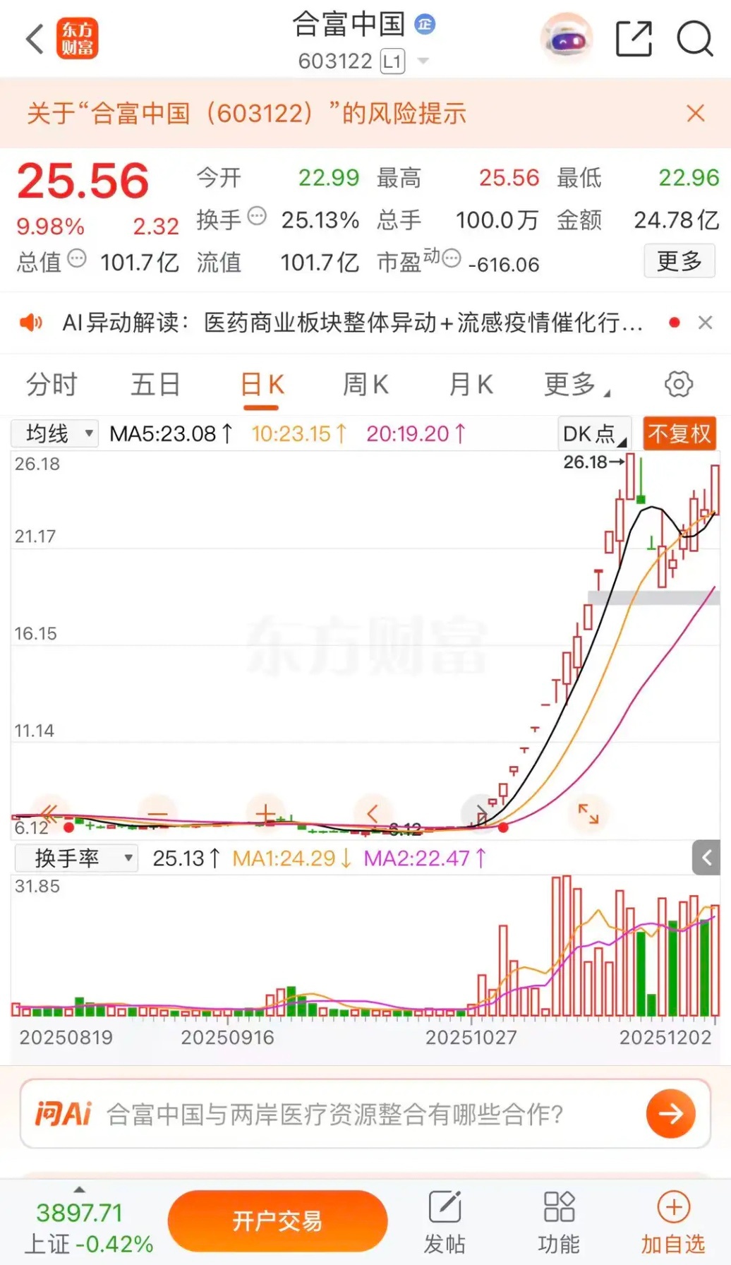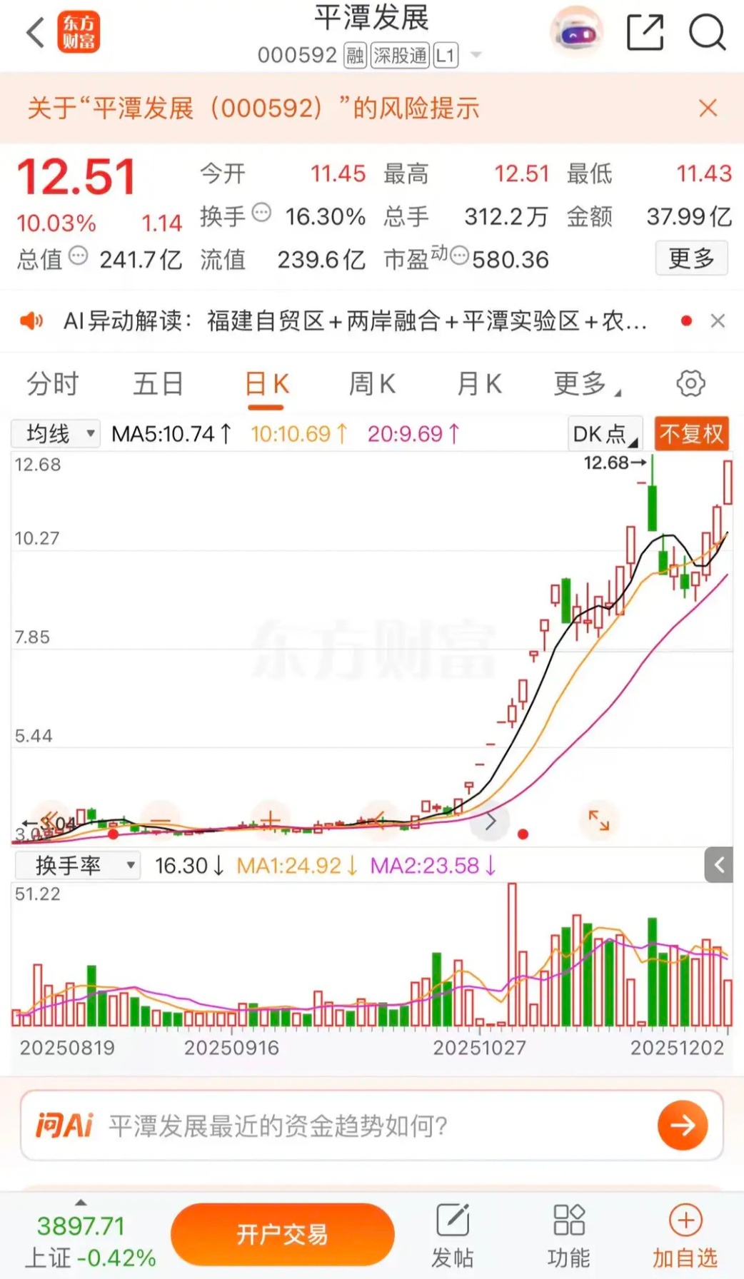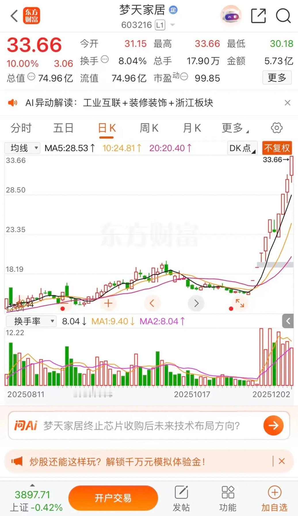 合富中国,平潭发展回归牛,梦天家居新晋牛梦天家居涨停板收盘报收33.66元每股,成交金额5.73亿元,达到10天7板涨停板,妥妥的新牛股。平潭发展涨停板收盘报收12.51元每股,成交金额37.99亿元,明天突破近期高点12.68元每股,回归牛。合富中国涨停板收盘报收25.56元每股。成交金额24.78亿元,明天涨停板28.12元每股,如果涨停就突破历史新高27.27元每股。大哥天普股份停牌核查回归