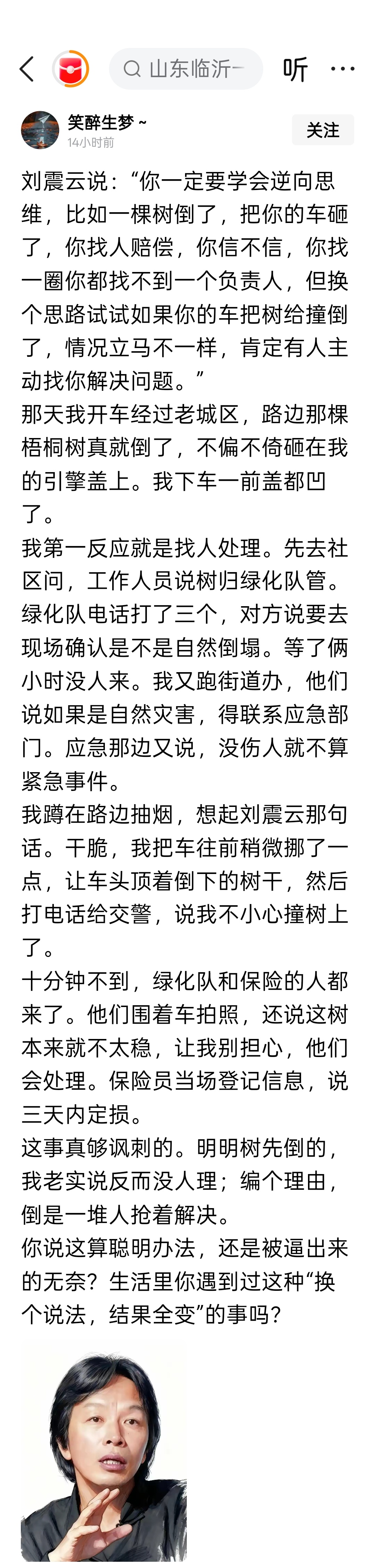 学会逆向思维,比如一棵树倒了,把你的车砸了,你找人赔偿,你信不信,你找一圈你都找不到一个负责人,但换个思路试试如果你的车把树给撞倒了,情况立马不一样,肯定有人主动找你解决问题