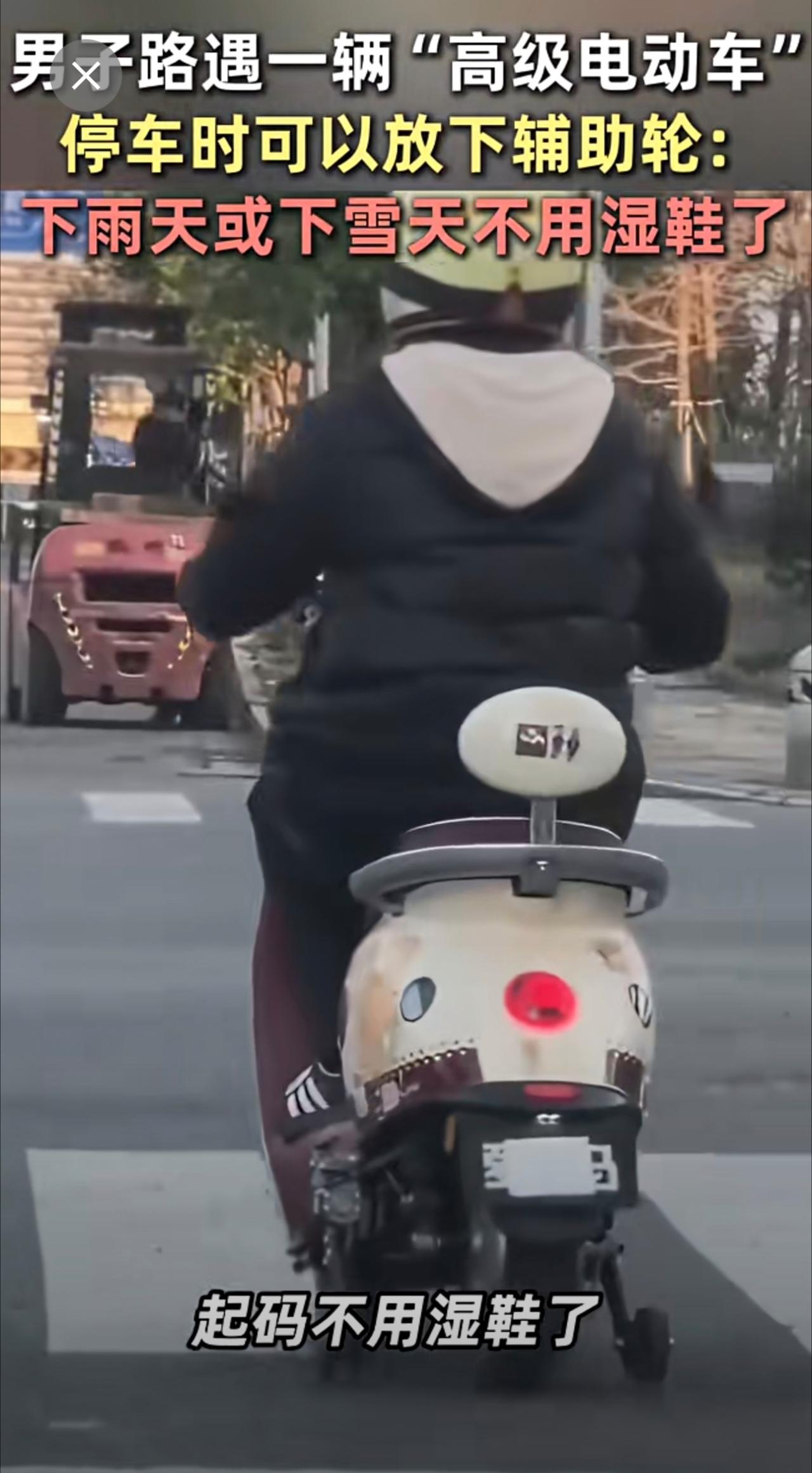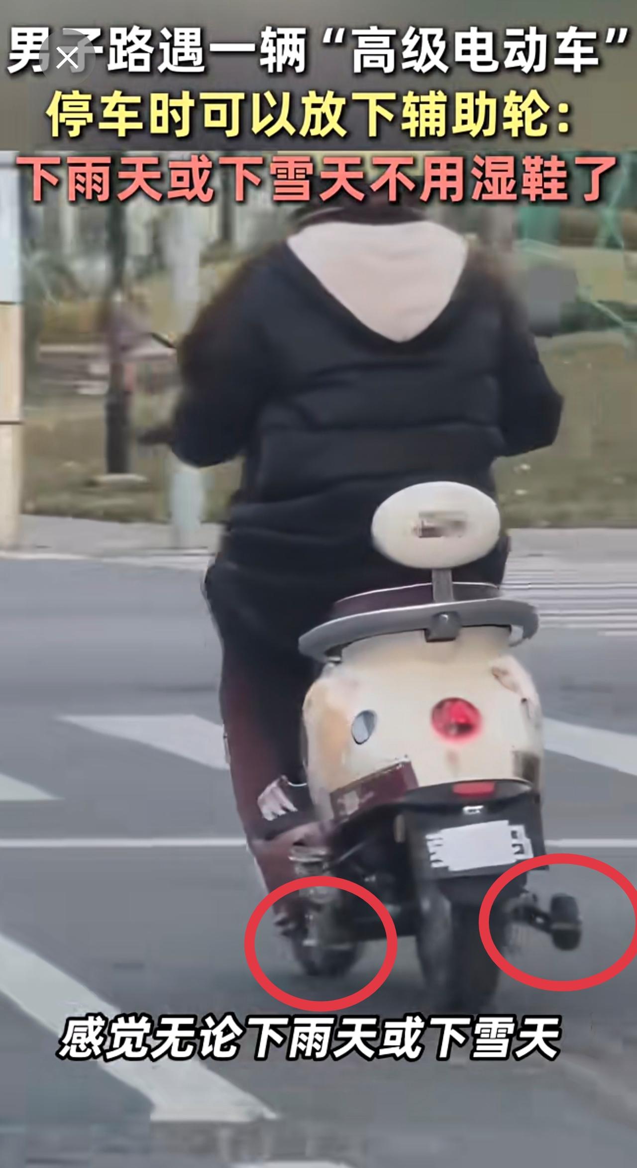 男子路遇一辆“高级电动车” 停车时可以放下辅助轮: 下雨天或下雪天不用湿鞋了。
