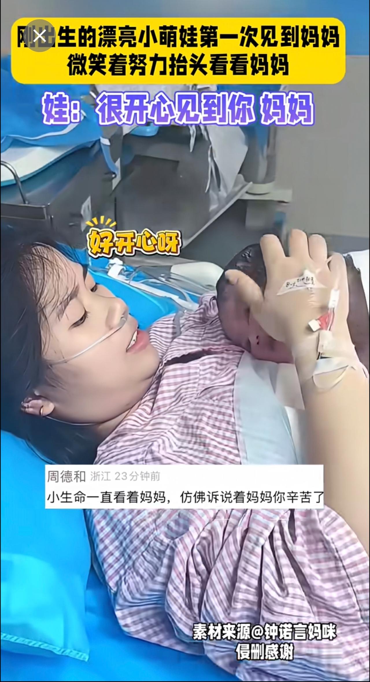 刚出生的漂亮小萌娃第一次见到妈妈,微笑着努力抬头看看妈妈,娃:很开心见到你,妈妈