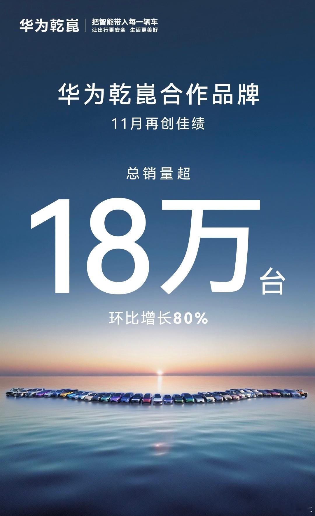 华为乾崑智能汽车解决方案今日宣布,华为乾崑伙伴品牌 11 月总销量超 18 万台,环比增长 80%华为乾崑