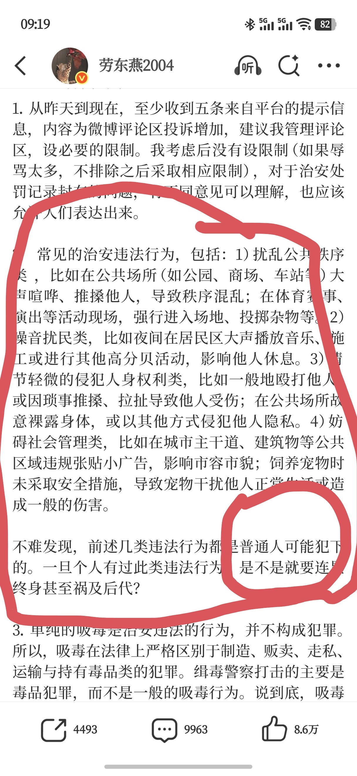 劳教授的观点为啥恶心呢?其一,她把没有素质的违法者称之为“普通人”——事实是:全国十四亿人口,就算老弱占一半还有7亿,日常生产生活7亿人,有几个天天违法的普通人?比例是多少?就按照另外那个分不清楚人次和人数的赵教授说的800万数据,占多大比例?怎么就普通人了?对吧?谁家普通人天天搁那违法啊?凭什么丫违法了要我们去宽容?该拘拘,该亮相亮相,一点儿问题没有啊。其二,又见国际接轨……一些腐朽的、肮脏的、下流的、龌龊的、资本主义制度下的垃圾国家就国际了?偏偏和一些堕落下贱的国家接轨哈?狗屁的国际接轨!给堕落下作找理由呢——与国际接轨,也没有往下接轨的,强奸犯戴脚环你们咋不接轨?吸毒入刑你们怎么不和国际接轨?怎么把国家往坏了整、怎么把普通人往火坑里推,你们就怎么接轨呗?真坏。