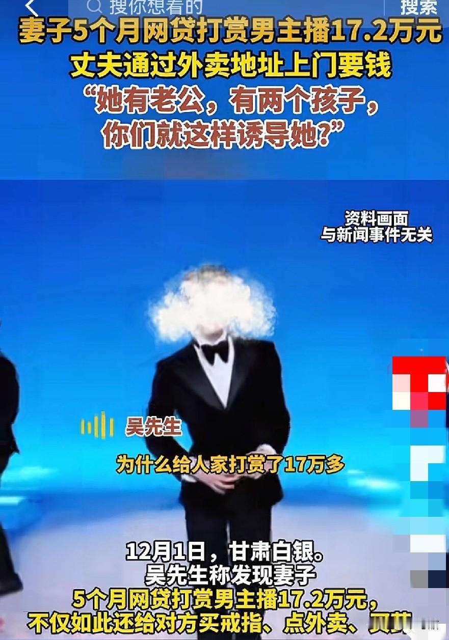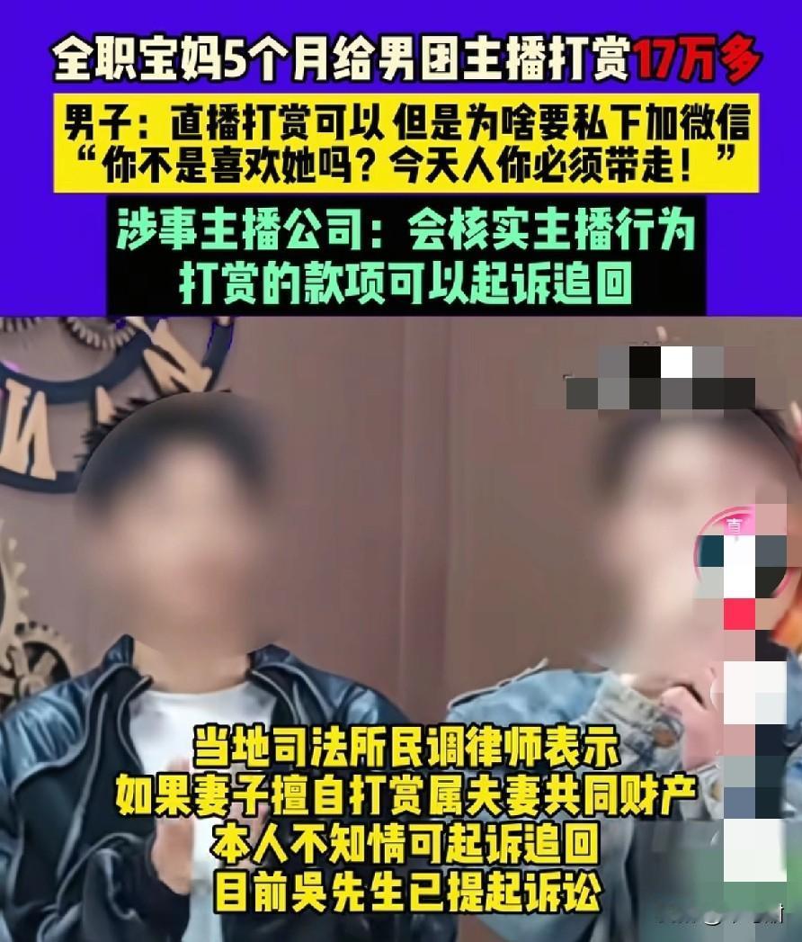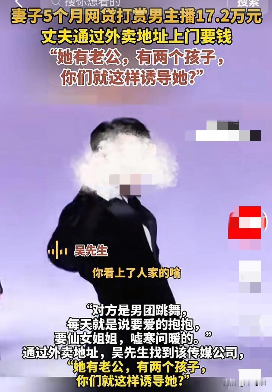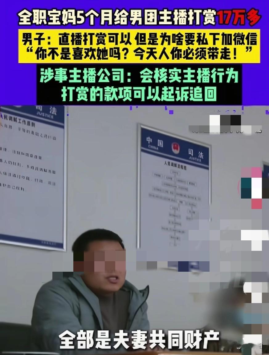 河南郑州,一家庭主妇兼2个孩子的宝妈,5个月时间打赏一男团主播17万多,这是被洗了脑吗?还以为这样的事情,一般都发生在男人身上,没想到也有男色诱惑啊。 近日一男子通过他老婆给别的男人点外卖的地址,找到打赏主播男团的公司,并且带上妻子,告诉相关负责人,这个女人为你们的主播打赏了17万,甚至私下加微信,姐姐长姐姐短,饿了给他点外卖,渴了就点奶茶,生病了还送药,说句喜欢还送戒指,既然这么喜欢,今天直接把他老婆带来了,成全他们。 但是女方用的是夫妻共同财产,女的爱怎么打赏是她的事,但是属于丈夫的一半必须归还。 真是世界之大无奇不有,这女的图什么呢,图人家小鲜肉长的好看又年轻,能说会舞,但别人又图她什么呢,长十岁的年龄,还是二个娃的妈? 谁都知道这些唱跳主播,靠的就是哄人的本事,找各种关注他们的粉丝,什么要去打PK,需要刷个礼物才完成任务啥的,哄得对方掏钱不说,还情绪价值给的老高了,换谁不迷惑呢? 该男子目前已经提起诉讼了,要求对方退还夫妻共同财产的打赏金,有律师说,胜诉很大,男子在不知情的情况下可追回。只能说这女的,真傻。 (图片来自网络视频)