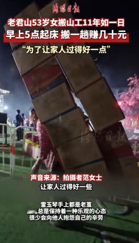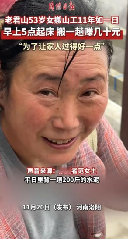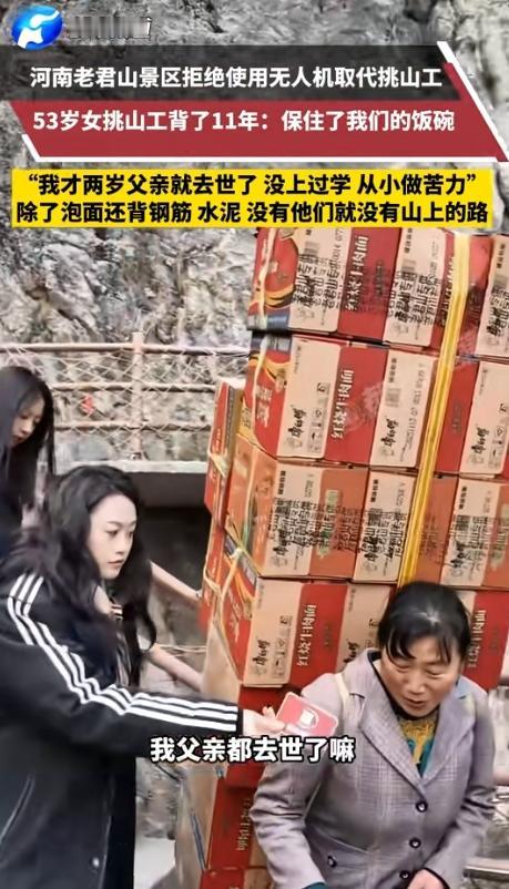 河南洛阳,女子在老君山当挑山工11年,每天背起200斤货物上山,记者问她干到什么时候,她说道:“我要干到60岁,女儿成了家,给婆婆攒几万块钱养老!” 去过老君山的朋友,肯定都对山上的石阶有印象——陡得攥着栏杆都发怵,但你们有没有留意过,那些背着比自己还沉的竹筐,一步步往上挪的挑山工? 53岁的雷玉琴,就是其中一个,这活儿她一干就是11年,清晨五点的老君山还裹着雾气,石阶上的露水能打湿鞋尖,雷玉琴已经蹲在物资点忙活了。 先铺层防水布防漏,再把矿泉水、方便面、盖房子用的小零件挨个码好,粗麻绳勒了一圈又一圈,直到200斤的货物纹丝不动。 她往肩上垫块磨得发亮的旧棉布,竹杠一上架,身子“咚”地往下一沉,攥紧杠头弓起背,踩着露水就上了路。 你说她不累吗?怎么可能,但这山上的每一级石阶,都记着她要给女儿攒嫁妆、给婆婆存养老钱的心思。 从山脚到山顶1800多级台阶,最陡的地方快赶上直立的梯子,游客走几步就喘得不行,雷玉琴却走得稳当。 只不过每走十步,她就得找个石墩子把竹杠架起来,双手撑着膝盖大口喘气,汗珠子顺着眼角的皱纹往下滚,把胸前的布衫浸得透湿。 一天往返六七趟,一趟最少三个钟头,遇上刮风下雨,石阶滑得像抹了油,她就把麻绳多缠几道在手上,死死抓着路边的灌木往上爬。 11年下来,她的肩膀被竹杠压出了一个深深的坑,手上的老茧硬得能当“搓脚石”,去医院检查,医生说再这么干腰就废了,她把诊断书往兜里一塞,第二天照样出现在山脚下。 不是她不爱惜自己,是家里的开销、老人的药费、女儿的学费,都等着她这副肩膀扛着呢。 雷玉琴和其他36个挑山工,平均年龄都52岁了,大多是周边村里的人,没什么文化和技能,除了干力气活没别的出路,这份苦差事就是全家的“救命钱”。 有网友说“以前总嫌山顶15块的泡面贵,现在才知道每一口都掺着挑山工的汗”。 还有网友说“比起老君山的风景,这些靠力气吃饭的人才更值得看”。 老君山景区的做法还算地道,给挑山工免费提供住宿,让他们下山能坐索道,每年还评“金扁担奖”发奖金。 但光靠景区不够,咱们得想个更实在的问题:这些挑山工老了干不动了咋办?他们大多没社保没医保,一身职业病,老了连看病的钱都成问题。 全国像雷玉琴这样的挑山工还有好几千,这个职业连国家职业目录里都没有,真出点事,保障都没地方找。 别总说“致敬劳动者”,空喊口号没用,把他们的社保落实了,给他们搞点技能培训,让他们老了有依靠,这才是真的尊重。 雷玉琴还在每天往老君山上走,200斤的担子压弯了她的腰,却没压垮她的脊梁,她不是什么“网红”,也不是什么“榜样”,就是一个想让女儿过好、让婆婆安度晚年的普通女人。 如果下次去景区,你碰到挑山工,会主动让个路、说句辛苦了吗? 信息来源:河南都市频道