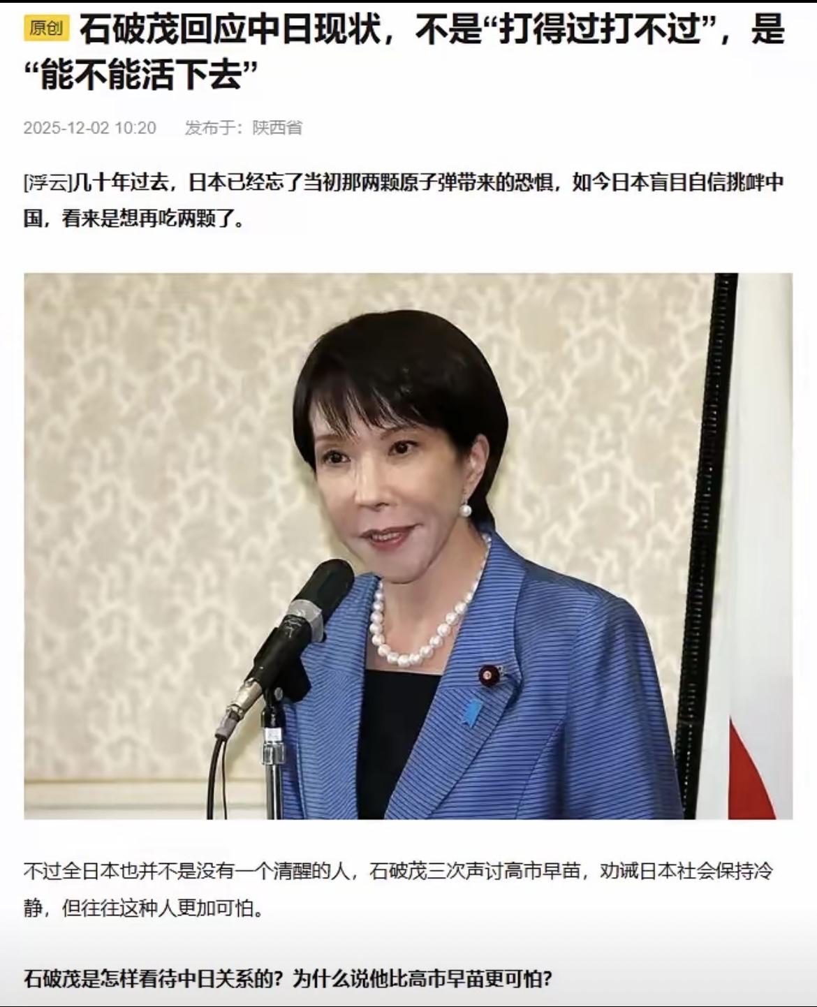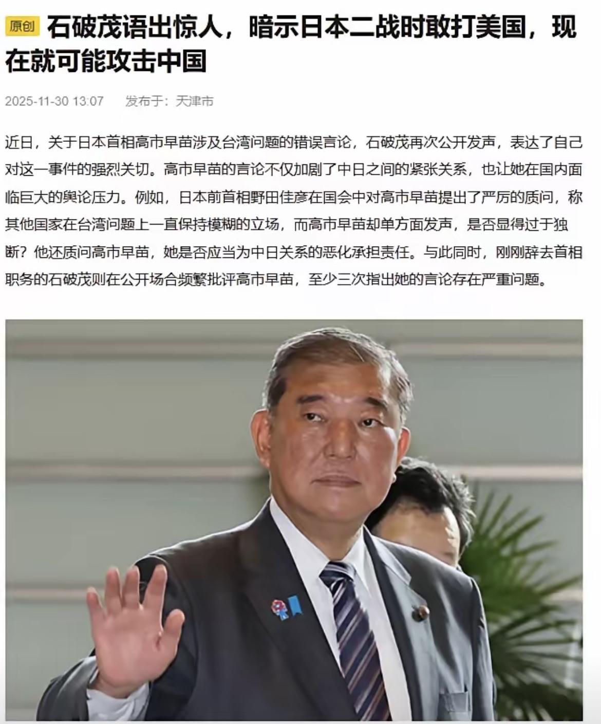 有媒体报道:石破茂在回答记者提问:中日会否有一战时,他语出惊人! 在最近的一期电视节目中,石破茂在回答记者就高市早苗挑衅中国的言论提问:中日会否将有一战时?他如实回了一句反问:当年明明知道国力和美国差了十倍,为什么还要去偷袭珍珠港呢? 这段话,一下子把很多日本国内自己不敢说、但又心知肚明的问题点了出来。也让人不由得反问:历史的教训,真的有人愿意再走一遍吗? 先把背景理清楚。 近期日本政坛,部分人物在涉华议题上不断释放刺激性言论,从稀土问题到台海议题,一套动作连着一套动作。尤其高市早苗的相关表态,让地区局势本来紧绷的弦,又被拽紧了几分。就在这样的气氛下,石破茂发表这番反问,显得格外意味深长。 第一,从日本国内政治来看。 石破茂的这句话,不只是“反问”,更像是一记“敲醒”。 当年日本选择挑战美国,是在国力完全不对等的情况下硬上,结果付出了沉重代价。石破茂把这一幕翻出来,明显是在提醒日本社会:历史不能装作没发生,现实不能被情绪绑架。 这对于如今还在煽动对立情绪的政客,是一种无声的“泼冷水”。 第二,从国际格局来看。 今天的中日对比,与当年的日美完全不是一个逻辑。 亚洲经济大局早已重构,中国是日本最大的贸易伙伴和供应链依存方。各类公开数据都显示,中日经济的体量差距与依存关系远远超过上世纪。而现代国际关系,更讲究产业链、供应链的稳定性,不是靠几句政治口号就能改写的。 换句话说,中日关系的现实利益之深,不可能允许任何轻率的“冒险主义”。 第三,从地区安全来看。 日本内部的一些声音,把“紧张”当成政治筹码,却常常忽略一个最基本的事实:真正稳定地区局势的,是冷静的判断、稳妥的对话,而不是把历史的旧剧本翻出来继续演。 石破茂提出珍珠港的例子,就是在提醒:误判,是最危险的敌人。 在地缘竞争加剧的时代,任何国家都承担不起“误判”的代价。 放到更大范围看,中国的国家战略一直强调和平发展、合作共赢,这些年也持续通过沟通、协商稳定周边环境。从台海到东亚,影响局势稳定的关键因素,从来不是中国,而往往是少数政治人物的错误判断和不负责任的言论。 而对多数日本民众来说,和平、发展、稳定才是他们真正关心的。任何让地区回到对抗循环的声音,都与民意相违背。 所以说到底,关键仍然在我们自己。 国际局势风云变幻,但只要国家脚踏实地、稳健前行,就无需被任何外部噪音牵着走。实力,是最好的底气;理性,是最强的安全。 以上是小编个人看法,如果您也认同,麻烦点赞支持!有更好的见解也欢迎在评论区留言,方便大家一同探讨。