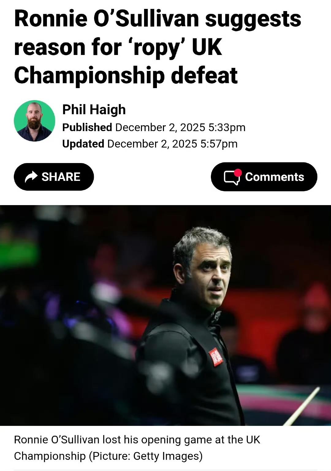 “火箭”连续两年在英锦赛首轮出局! 罗尼·奥沙利文在4-6输给周跃龙赛后说道:显然他打得更好,我并没有给他制造太多麻烦,出现了很多低级失误。他配得上这场胜利。 奥沙利文表示:我享受比赛的感觉,从赛季开始一直如此,但这场发挥确实欠佳,我必须承认这点,不会逃避问题。我感觉击球总体不错,这才是最重要的。 奥沙利文此前曾暗示可能缺席明年一月份的大师赛,本次败北后大师赛之行也未作任何承诺。