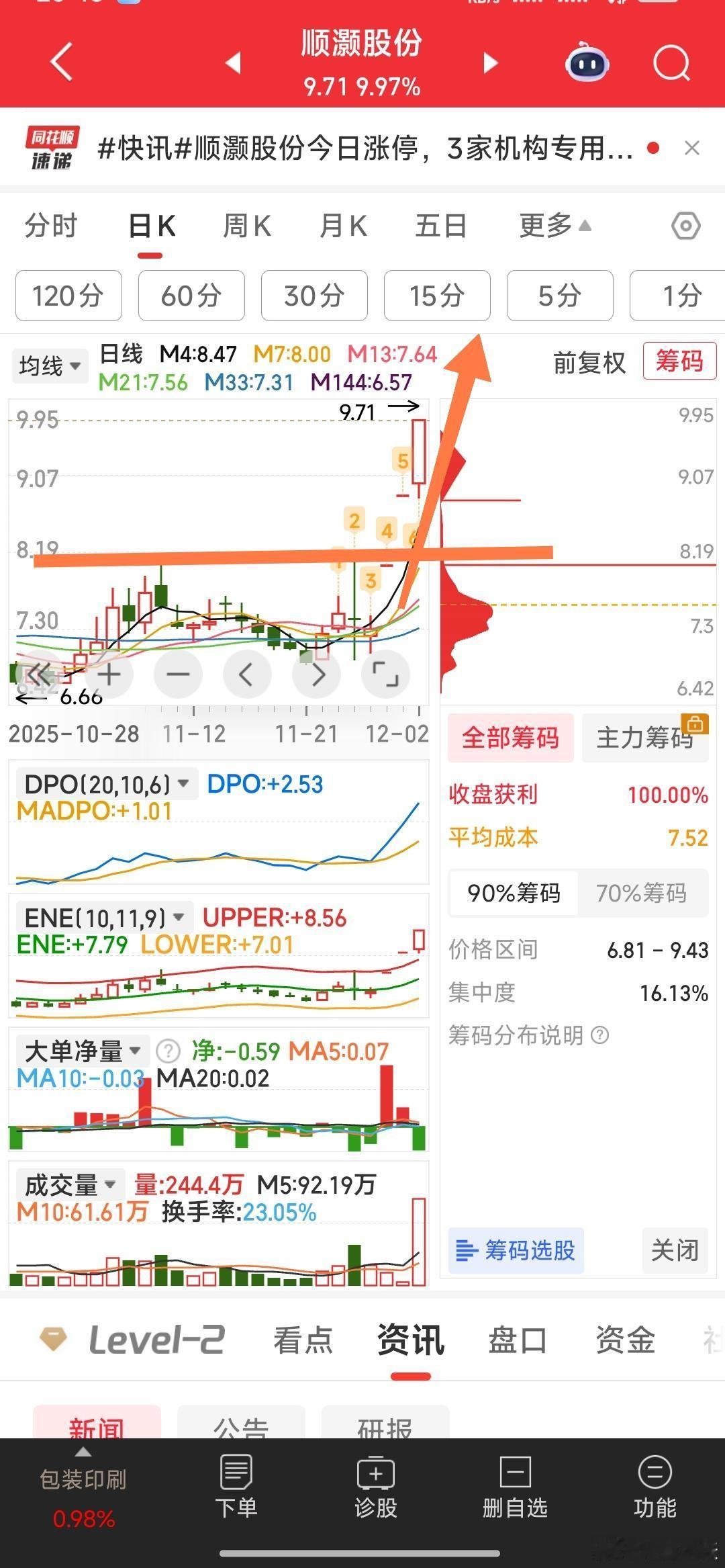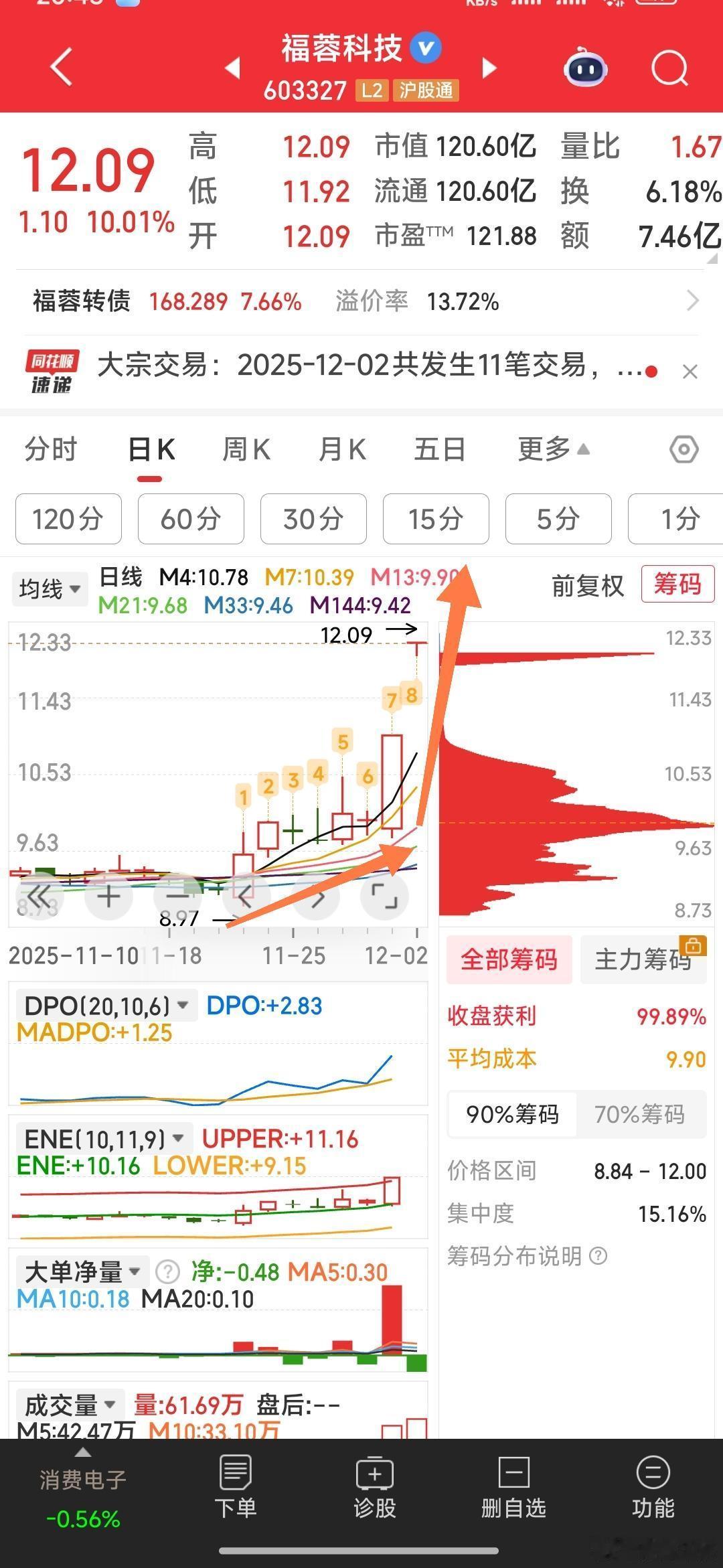 【明天的看盘预期及重点跟踪的强牛】1,实达集团,明天站上6.29元则宣告强势确立。2,福蓉科技,刚拐点45°拉升,明天溢价是肯定的。3,顺灏股份,刚过前高,机构抢筹,明天等涨停。4,万通发展,小平台蓄势待发,明天有望突破向上。5,标准股份,不破9.97元120分钟M21均线就持,若破则再减。新大股东入驻值得期待,但钝刀子下滑消磨人的意志。6,明天重点自选跟踪的几票:①高乐股份,②苏豪汇鸿,③榕基软件,④国风新材,⑤人民同泰,⑥恒银科技,⑦太阳电缆。⑧航天发展。我准备干其中2票。7,明天手中票按预判操作,符合预判持有,不符合预判就走人。8,以上观点仅自己一孔之见,不求任何人认同并跟随。有缘人就点个888,无缘人就划过而去。1