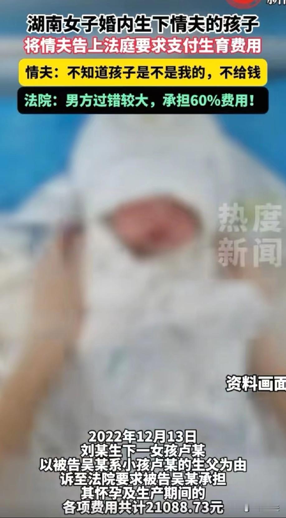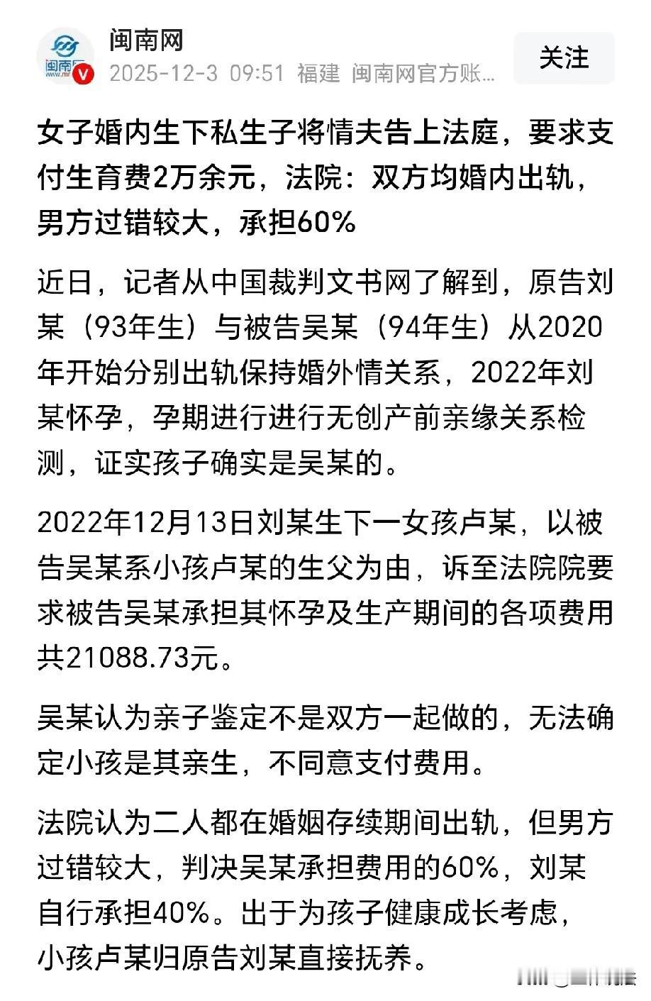 湖南,女子婚内结识有妇之夫,两人很快发展为不正当关系。不久后,女子怀孕,为了确定孩子的生父,她在产前做了无创亲缘关系的检测,证实孩子是情夫的。孩子出生后,女子要求情夫支付2万元生育费,情夫以亲子鉴定不是他们一起做的为由,否认这个孩子是他的。女子告上法庭后,法院的判决亮了。网友质疑:这难道不是重婚罪吗? 1993年出生的刘女士和丈夫结婚后,日子过得平淡如水,渐渐没了当初的新鲜感。 2020年,一次偶然的机会,她认识了比自己小一岁的男子吴某,彼时两人都有各自的家庭,却还是被彼此吸引,越走越近。 明知这段关系违背道德伦理,可刘女士还是没能抵住诱惑,和吴某发展成了不正当的婚外情。 相处中刘女士渐渐对吴某动了真情,甚至觉得这份地下恋情比自己的婚姻更让她心动。 2022年,刘女士意外发现自己怀孕了,这个消息让她又喜又慌。喜的是,她觉得这个孩子能拉近自己和吴某的距离;慌的是,她不确定孩子的生父到底是丈夫还是情夫。 为了弄清真相,也为了给这段感情一个“交代”,刘女士在孕期悄悄做了无创产前亲缘关系检测。 当看到检测报告上“确认吴某为孩子生父”的结论时,刘女士悬着的心落了地,她觉得吴某一定会对自己和孩子负责。 2022年12月13日,刘女士顺利生下一个女婴。看着襁褓中粉嫩的小家伙,她相信吴某一定会给她和女儿一个交代。 刘女士算了下,怀孕和生产期间,检查费、住院费、营养费加起来一共花了21088.73元,这笔钱都是她垫付的,这些钱无论如何都应该让吴某来承担。 可让刘女士没想到的是,吴某的态度来了个180度大转弯,他直言这份亲子鉴定是刘女士单方面做的,自己根本没参与,不能算数,还一口否认孩子是自己的,坚决不肯支付费用。 吴某觉得,当初是你情我愿的事,现在孩子生下来了,凭什么让他一个人出钱?而且他不相信,这个孩子就是他的。 刘女士想不通,当初甜言蜜语的吴某,怎么会变得这么绝情。她不甘心自己独自承担所有费用,更觉得孩子的生父没有理由置身事外。 多次协商无果后,刘女士将吴某告上了法庭,要求支付怀孕及生产期间的各项费用21088.73元,并承担孩子的抚养责任。 法庭上,双方各执一词。刘女士情绪激动地陈述了两人的婚外情经过,提交了亲子鉴定报告、医疗费用票据等证据。 而吴某则始终坚持,亲子鉴定不是双方共同委托做的,检测过程他并不知情,无法确认孩子的亲生关系,拒绝承担任何费用。 《民法典》第一千零七十一条规定:非婚生子女享有与婚生子女同等的权利,任何组织或者个人不得加以危害和歧视。 不直接抚养非婚生子女的生父或者生母,应当负担未成年子女或者不能独立生活的成年子女的抚养费。 虽然刘女士单方面做的亲子鉴定在程序上存在一定瑕疵,但结合检测机构的资质、检测结果的科学性以及双方婚外情的时间线,足以认定吴某是孩子的生父。 吴某以“亲子鉴定非双方共同委托”为由抗辩,但未提交相反证据反驳,也未申请法院重新鉴定,因此无法证明他的主张。 刘女士怀孕及生产期间的21088.73元费用,本质是子女抚养的前期必要支出,吴某作为不直接抚养子女的生父,理应依法负担相应份额。 《民法典》第一千零四十三条规定:夫妻应当互相忠实,互相尊重,互相关爱;家庭成员应当敬老爱幼,互相帮助,维护平等、和睦、文明的婚姻家庭关系。 刘女士与吴某均在婚姻存续期间与他人建立不正当关系,明显违反了夫妻忠实的法定义务,双方对损害结果均存在过错。 吴某在证据充分的情况下,仍否认亲子关系、拒绝承担费用,其行为不仅违背道德伦理,更加重了刘女士的负担,过错程度更为严重。 最终,法院作出判决:考虑到双方的过错程度,由吴某承担60%的生育费用,即12653.24元,刘女士自行承担40%;同时,为了孩子的健康成长,判决女婴由刘女士直接抚养。 判决结果一出,有人疑惑,两人都婚内出轨,这难道不构成重婚罪吗? 不管怎么说,这段始于错误的婚外情,最终以这样的方式收场,留给两个家庭的,却是无尽的伤害。