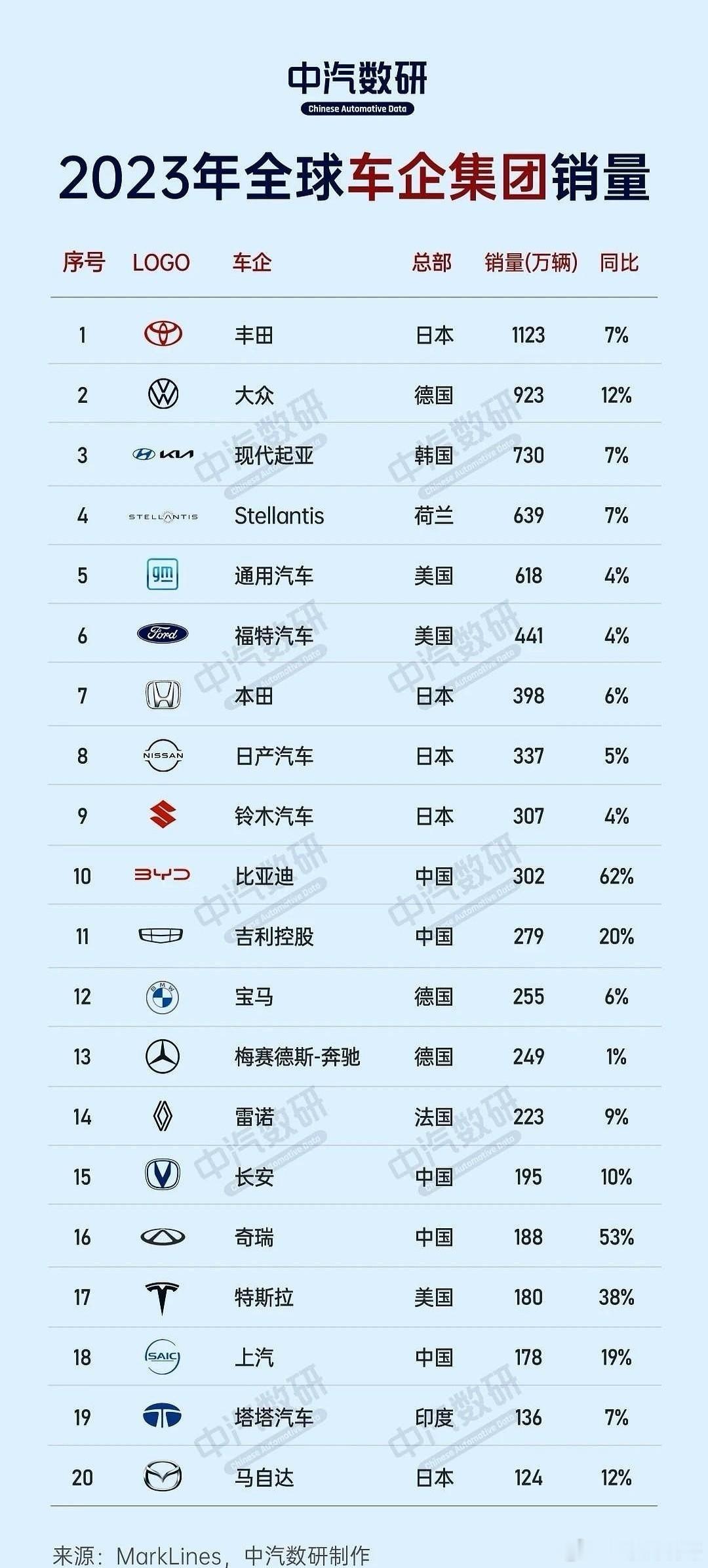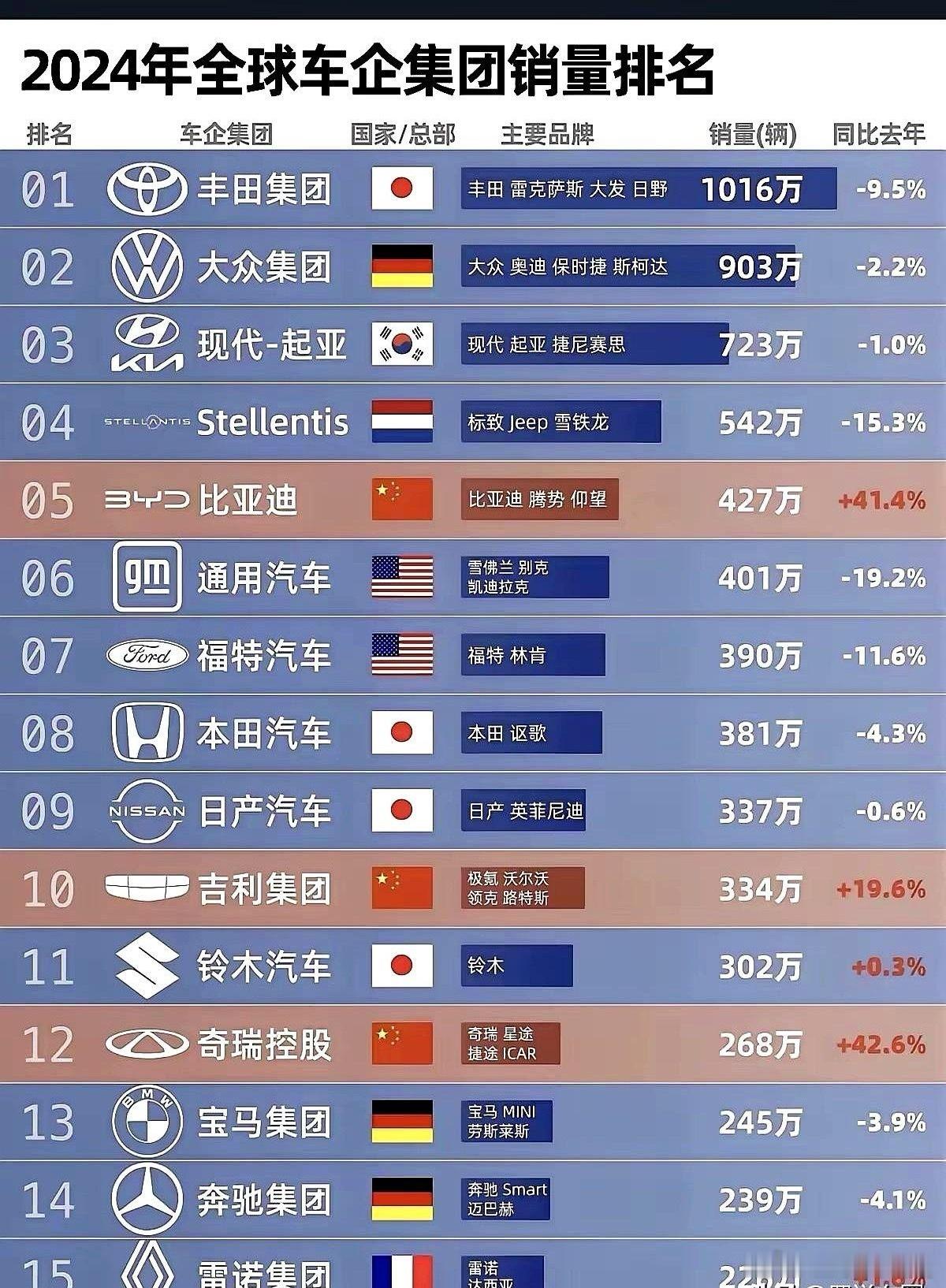 丰田蝉联第一没悬念,大众和起亚也还在老位置,不过榜单里真正抢镜的是中国面孔——比亚迪冲到全球第五,吉利第十,奇瑞第十二,参考OICA和各家财报的数据,他们在2024年前三季度合计卖了超550万辆;对比2023年的排位,三家加起来净增近120万辆,这波明显不是“运气好”,而是趋势到了拐点。细拆原因,燃油车全球见顶已被反复推演,真正拍桌的是新能源的爆发式渗透,国产三家用“油电双修”打法收割国内市场,再把刀口对准东南亚、拉美和东欧,工信部口径里比亚迪出口同比涨161%,奇瑞依靠小排量燃油车和混动方案在巴西一路高歌,吉利靠收购沃尔沃带来的欧洲渠道扛住了前期门槛,这些动作背后是成本控制——电池自产、自研三电、供应链本地化,全都把价格打到合资对手不可思议的区间。话说回来,路也不全是平的,欧盟刚刚启动对华电动车反补贴调查,美国关税大棒年年挥,中国车企要稳住增量就得在专利、服务和品牌溢价上补课,另外国内价格战还在“连环扣”,利润被压得嘎嘣响,如果没有技术护城河,量涨可能只是昙花,投资人和车主都盯着这一点,不是没道理。时间来到2025年四季度,比亚迪大概率摸到全球前三的门槛,吉利和奇瑞要冲击单年400万辆也并非玄学,真正的悬念是:当国外老牌车厂全面转向纯电并开始价格反杀,中国车企能否让技术高墙先筑起来再谈规模,这才是决定下一份排行榜长什么样的关键。