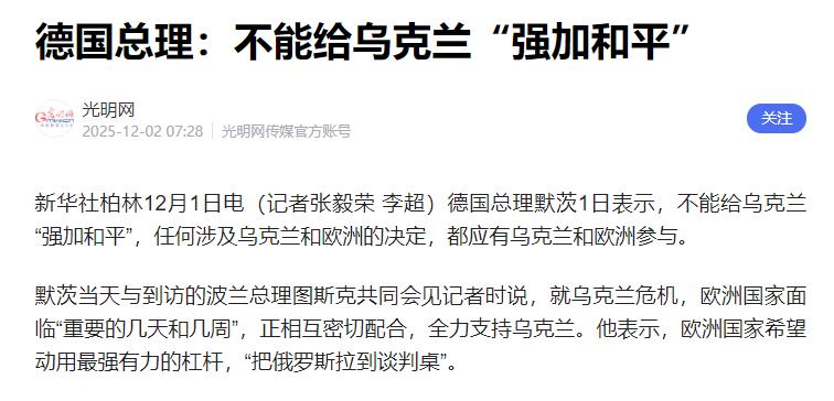 针对俄乌问题,德国总理默茨表态,信号不简单。 德国总理默茨12月2日那番“不给乌克兰强加任何和平”的表态,听着像是站在乌克兰立场说话,其实仔细琢磨就会发现,这话里藏着欧洲好几层没明说的意思。 而且这话选在这个时间点说,本身就很有讲究,不是随便发个言那么简单。首先得想明白,默茨为啥要在这时候强调“不强加和平”? 看看最近的局势就清楚了,美国那边正带着乌克兰谈停火,据说已经有了不少进展,但谈判里乌克兰得让渡一些利益,这事儿欧洲其实早有耳闻,却一直没拿到真正的话语权。 默茨这时候站出来说话,说白了就是给这场美国主导的谈判划条线:别把欧洲当空气,更别替欧洲做决定。 要知道,俄乌打了这么多年,欧洲可不是看客,德国往乌克兰送的钱和武器堆起来都不少,现在要谈和平了,居然没欧洲什么事,换谁都不会甘心。 默茨特意提了和波兰总理、乌克兰总统都通了气,这更像是在对外宣告:欧洲内部是有共识的,而且和乌克兰也沟通过,不是没资格参与进来。 再往深了想,“不强加和平”这话也是说给美国听的,是欧洲对美国“越俎代庖”的委婉抗议。这些年欧洲跟着美国援乌,付出的代价可不小,能源价格飙涨、通胀高企,不少企业都受了影响。 可现在美国想拍板结束冲突,只顾着自己的战略安排,根本没怎么考虑欧洲的安全需求。默茨强调“不削弱或分裂欧盟和北约”,潜台词就是:和平协议得符合欧洲的安全利益,不能为了停火就让欧盟内部闹矛盾,更不能让北约的凝聚力受影响。 毕竟乌克兰就在欧洲门口,停火后的安全格局直接关系到欧洲未来几十年的安稳,欧洲怎么可能眼睁睁看着美国独自决定? 之前有消息说美国搞了个“28点和平计划”,里面不少条款都没跟欧洲商量,这早就让欧洲国家心里不痛快了,默茨的表态算是把这种不满摆到了台面上。 还有个关键点容易被忽略,“不强加和平”也是欧洲在给自己留后路。打了这么多年,欧洲其实很清楚乌克兰的处境,也知道完全靠军事手段赢回所有领土不现实,但真要是逼着乌克兰接受不公平的和平,后遗症太大了。 且不说乌克兰人会不会甘心,万一未来局势再有变化,欧洲作为“施压者”肯定要背锅。默茨这话等于是明确了欧洲的立场:和平得是乌克兰自己愿意接受的,欧洲可以劝和,可以提供支持,但绝不会当那个“逼乌克兰让步”的人。 这种姿态既维护了欧洲的道德形象,也避免了未来被乌克兰或者国际社会指责。同时,这也是在稳定欧洲内部的团结。 毕竟欧盟里有的国家想尽快停火止损,有的国家则主张继续援乌,默茨用“不强加”这个原则把大家的立场统一起来,避免内部先分裂。 说到底,默茨的这句话本质上是欧洲对战略自主权的一次争取。这些年欧洲越来越清楚,跟着美国走虽然省心,但关键时候还是会被牺牲利益。 俄乌冲突让欧洲付出了这么多,却在和平谈判里没话语权,这种滋味肯定不好受。默茨的表态就是在告诉外界:欧洲的安全自己说了算,乌克兰的和平必须有欧洲参与,想绕过欧洲搞“私下交易”是行不通的。 这话里没有多少“无能为力”的无奈,反而满是“要拿回主动权”的坚定,这或许才是欧洲当下最真实的心思。