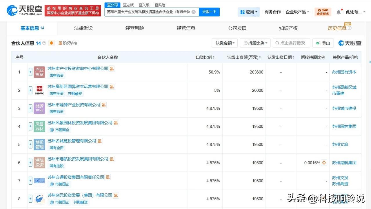【苏州市重大产业发展私募投资基金登记成立 出资额40亿】 天眼查App显示,近日,苏州市重大产业发展私募投资基金合伙企业(有限合伙)成立,执行事务合伙人为苏州产业投资私募基金管理有限公司,出资额40亿人民币,经营范围含以私募基金从事股权投资、投资管理、资产管理等活动,股权投资,创业投资,以自有资金从事投资活动。合伙人信息显示,该基金由苏州市产业投资咨询中心有限公司、苏州高新区国昇资本运营有限公司、苏州市能源产业投资有限公司等共同出资。 天眼查信息: