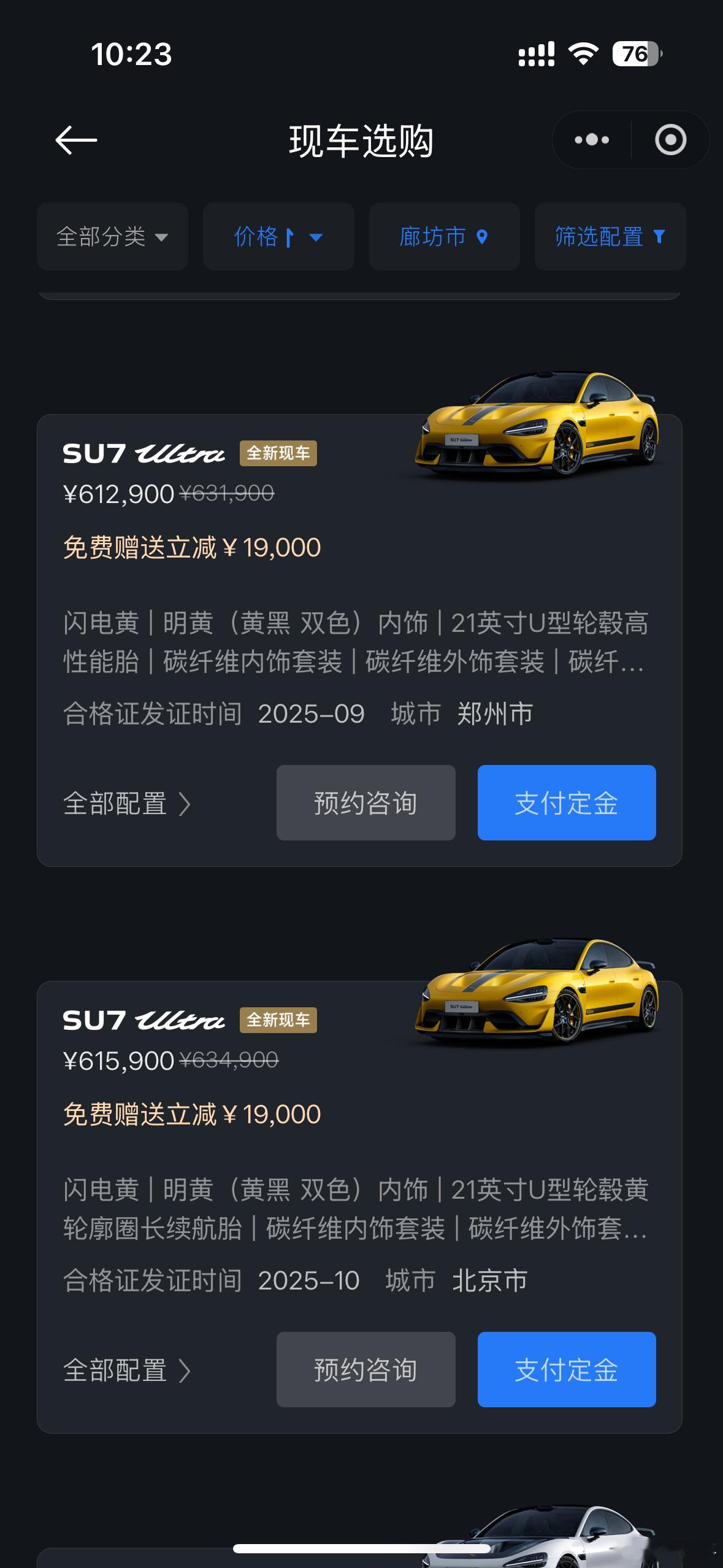 看了一下小米小程序,现车资源中SU7和YU7有各种优惠方案,但SU7 Ultra无一例外都是优惠1.9万。数了下有18台资源,感觉还是黄色最帅。新能源汽车大v聊车