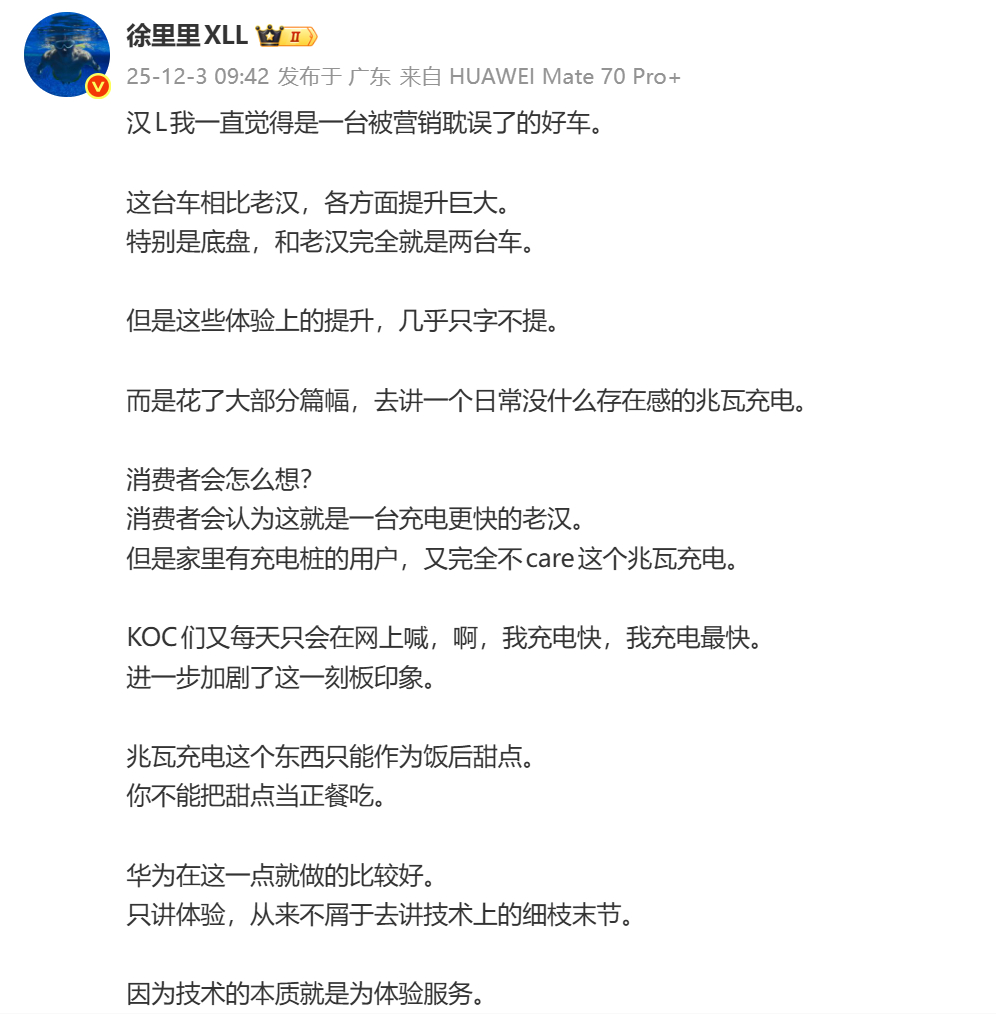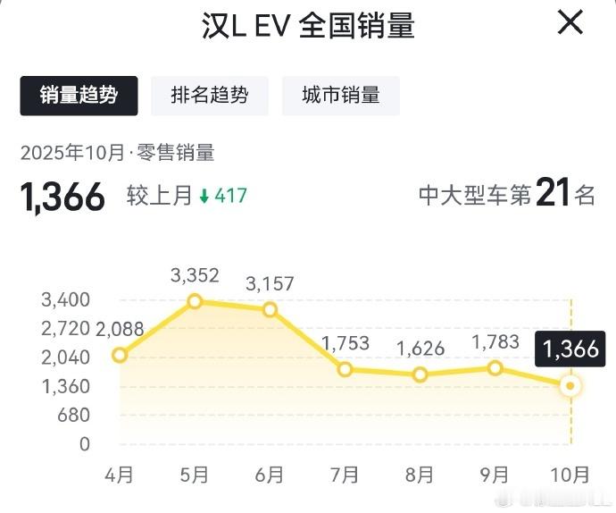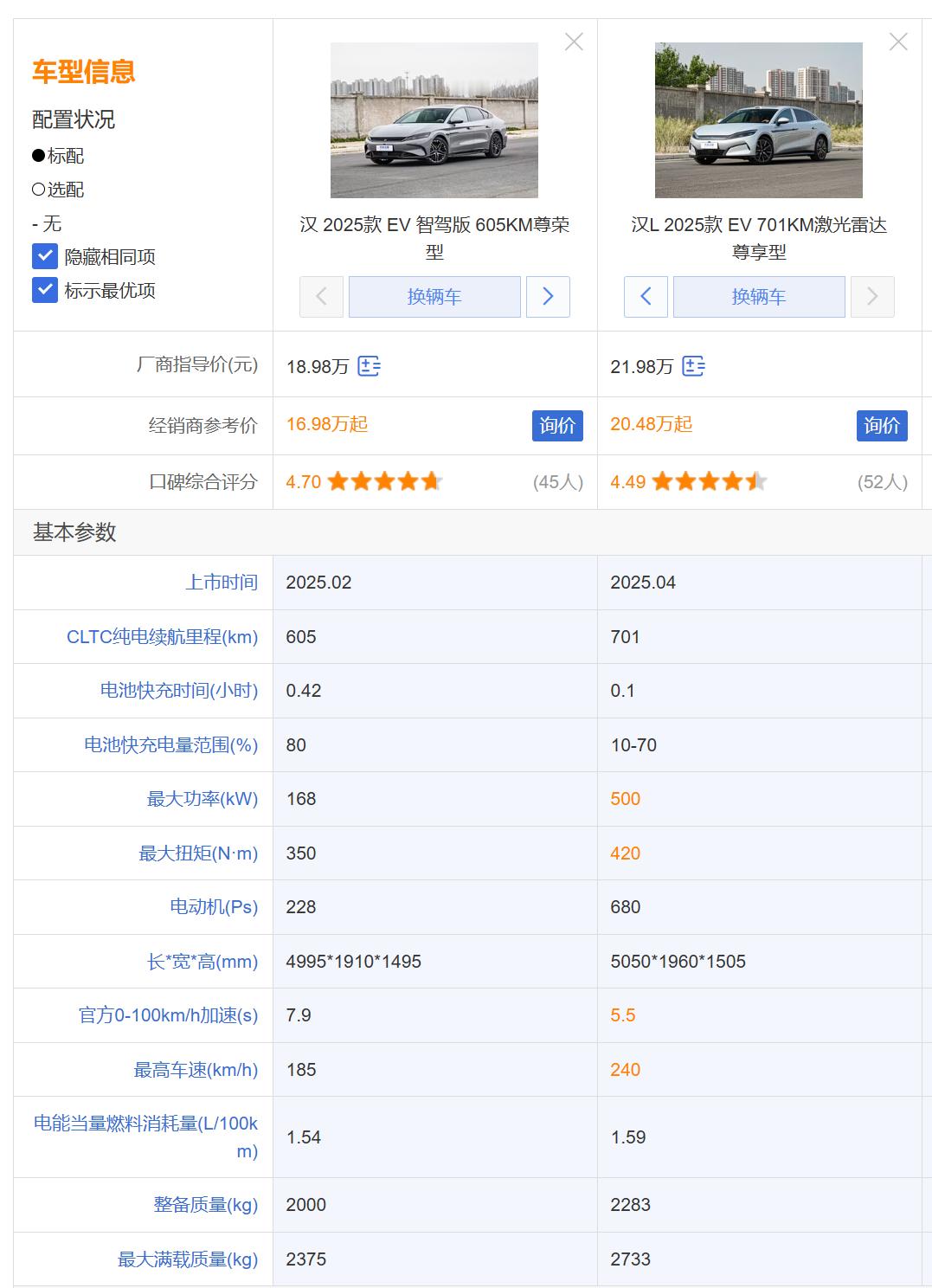 接着的话说,我也觉得汉L这车比汉的提升巨大。前驱升级成了后驱228马力提升两倍来到680马力续航增加100公里来到701公里智驾算力提升两倍,还多了激光雷达更关键的是,汉L EV开起来也比汉EV强很多,汉EV上很多匪夷所思的老问题也解决了。然而汉L并没有受到市场认可,现在月销量已经下降到了1k+,金九银十也没起色。只能说比亚迪用户并不愿为了更好的性能品质和技术升级,多花这3万块钱