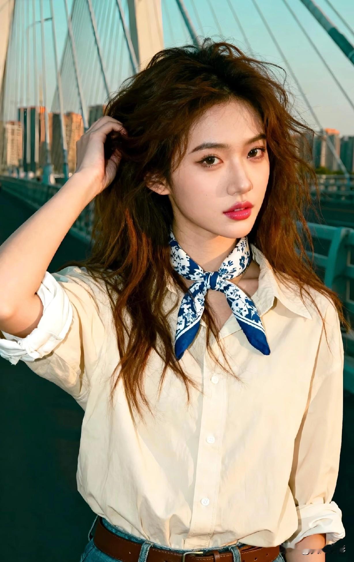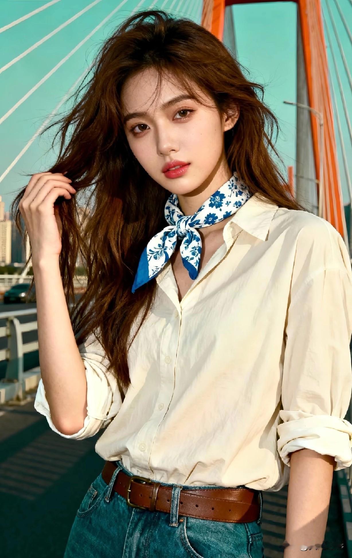 光之影 都市少女风,蓝白印花丝巾,轻松随性