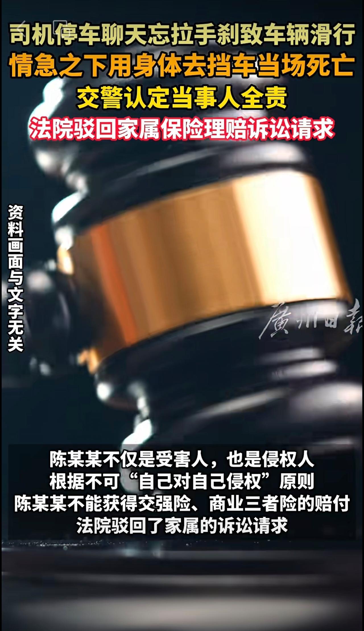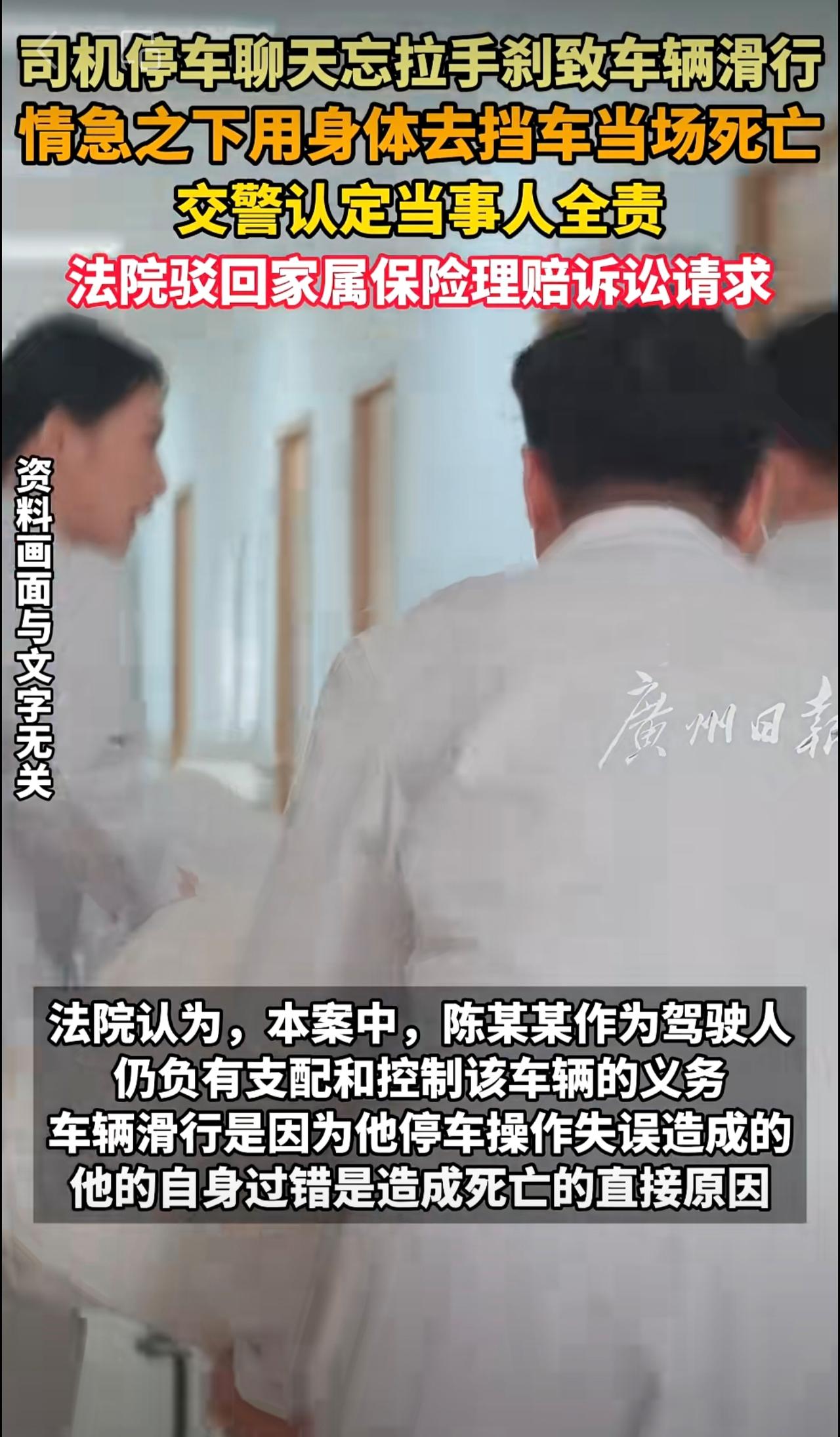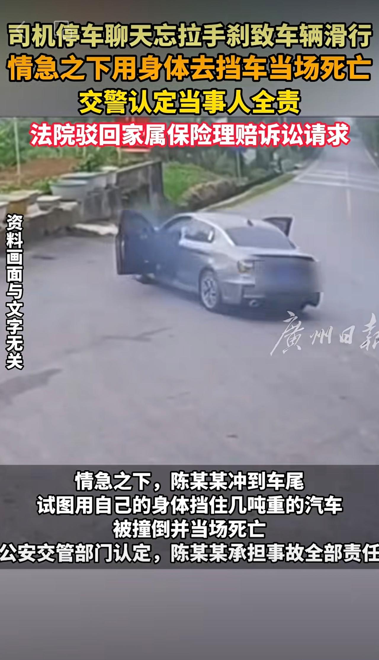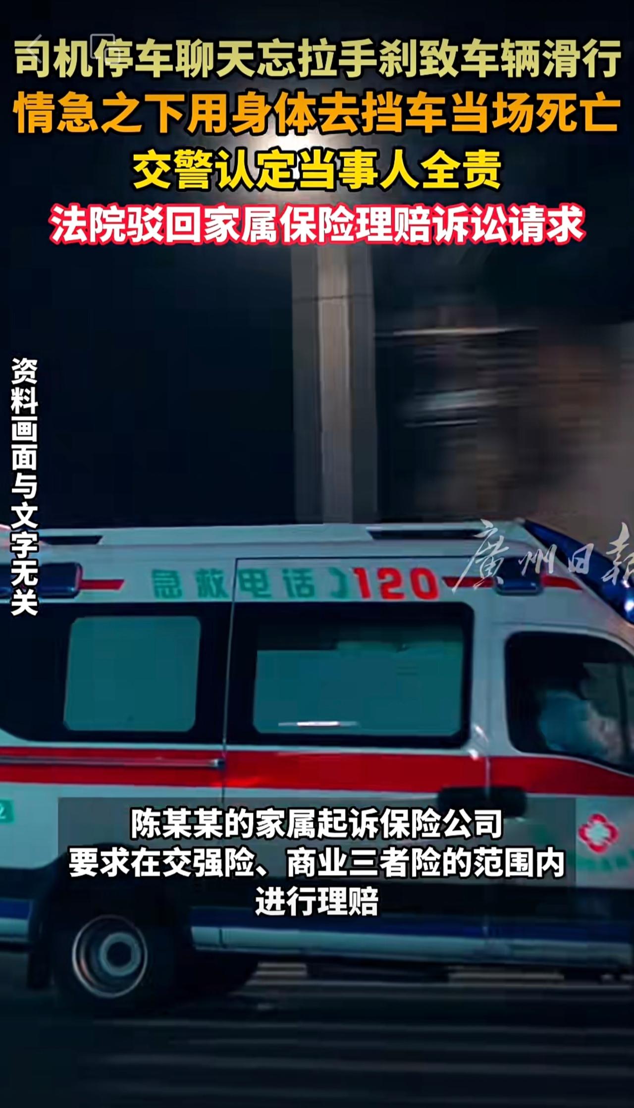 司机停车聊天忘拉手刹致车辆滑行,情急之下用身体去挡车当场死亡,交警认定当事人全责,法院驳回家属保险理赔诉讼请求