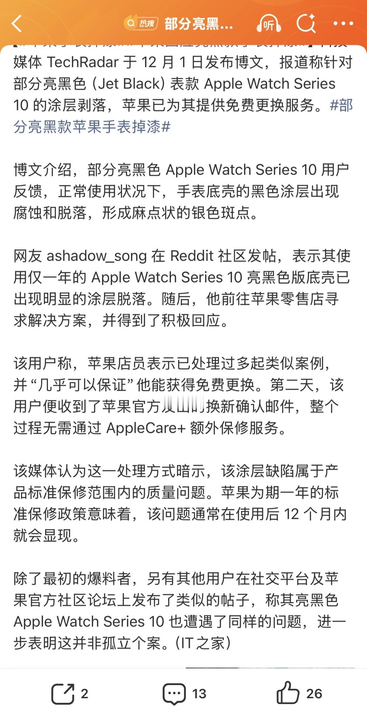 Black)表款 Apple Watch Series 10 的涂层剥落,苹果已为其提供免费更换服务(TechRadar) 有中招的?[吐舌]