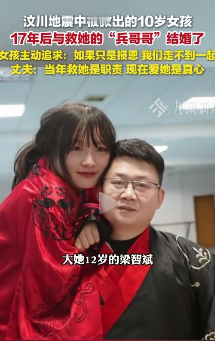大瓜来了!2008年汶川地震中,一名10岁小女孩被一位兵哥哥救了出来。17年后,她与救她的兵哥哥结婚了! 女孩是主动追求兵哥哥的,她还说:“如果只是报恩,我们走不到一起。”而兵哥哥也超深情,他说当年救她是职责,现在爱她是真心。这不就是现实版的双向奔赴嘛! 从当年的救命之恩,到如今的携手一生,这中间的缘分真的妙不可言。他们的爱情就像一颗闪闪发光的星星,照亮了我们这些“嗑糖人”的心。这也让我们看到,在这个世界上,真的有纯粹又美好的爱情。 家人们,快来和我一起为这对新人送上祝福吧!希望他们能一直甜甜蜜蜜,长长久久!
