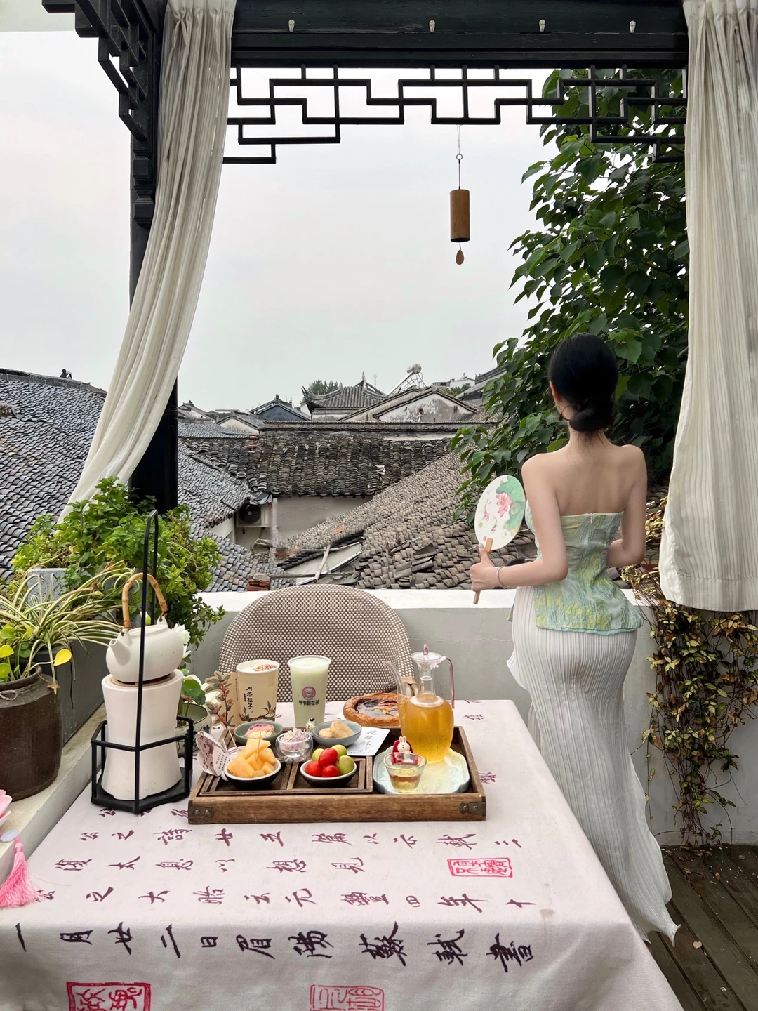 露台边上的桂树配上粉墙黛瓦的苏州建筑