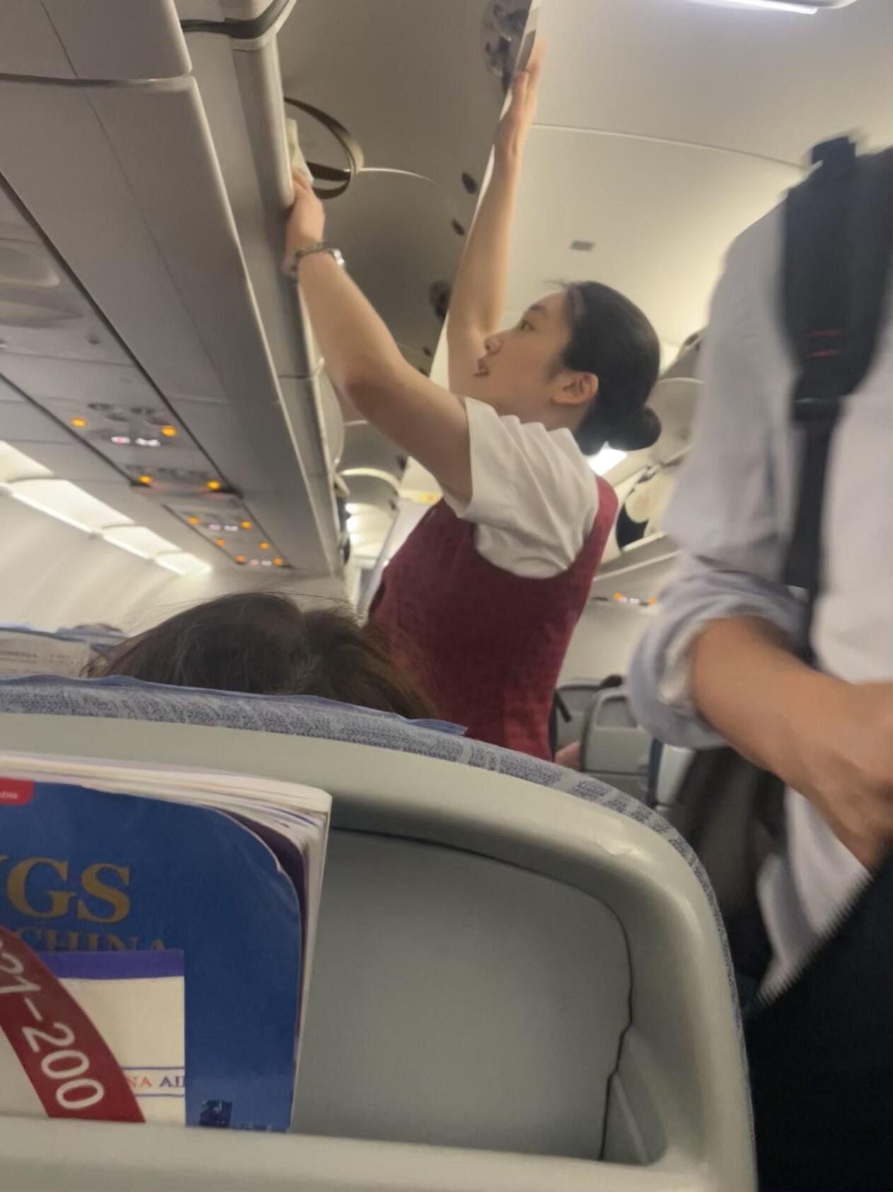 空姐在飞机上忙碌工作,乘客们安静地休息。