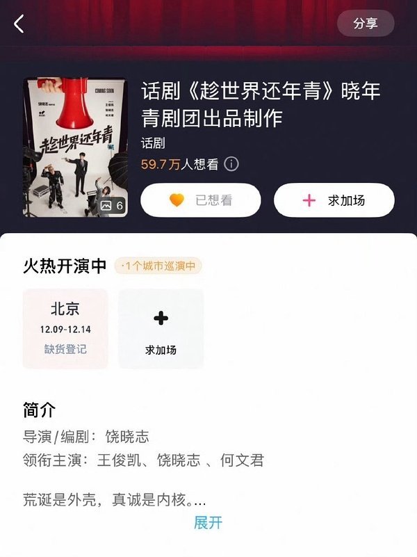 王俊凯话剧破记录了🤯💥1️⃣🎫选座5s售罄,秒没😵2️⃣24h内大麦单平台预约抢票人数高达56w ,总系列想看人数逼近60w (目前还在增长中)💥🎫一开,直接登顶大麦热搜第一💥打破内娱话剧想看的纪录NO.1(不需要任何限定词❗❗❗3️⃣剧团涨粉60w不愧是顶流,出组开个话剧直接带动人流和扩大话剧市场