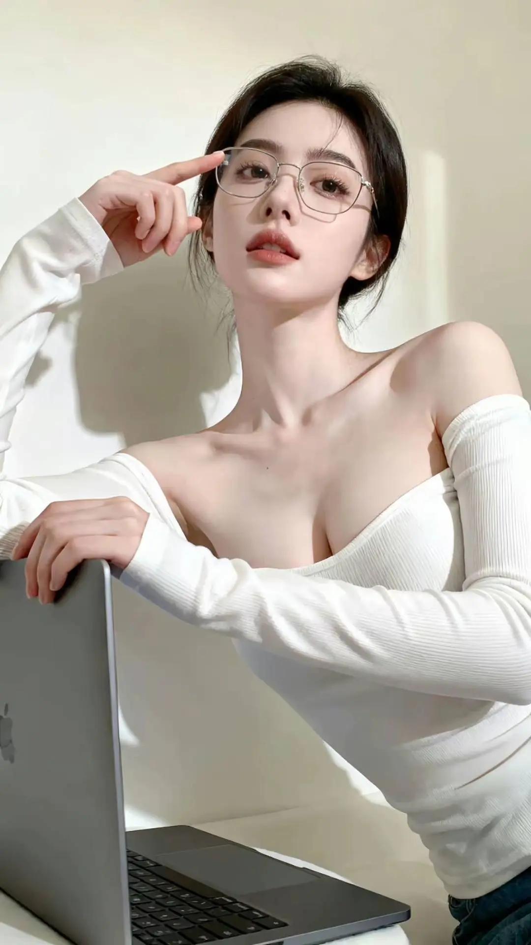 优雅办公时光,白衣少女与苹果笔记本的完美搭配。什么样的女生让人一见难忘?
