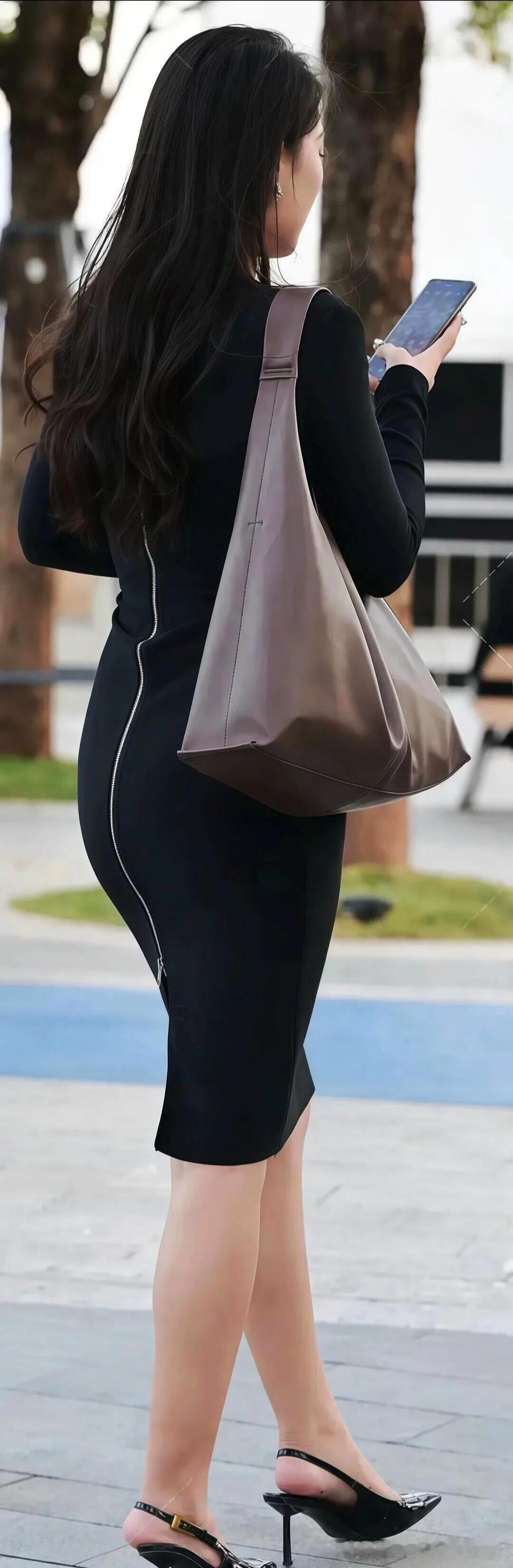 今日分享黑色修身包臀连衣裙穿搭,属于气质轻熟风的穿搭~ 从细节看: - 裙子是弹力针织材质,紧身版型能凸显身材曲线,侧边还有装饰线设计增加精致感; - 搭配了黑色细跟凉鞋,简约又显腿长; - 还背了一个深棕色的大容量包包,整体风格优雅干练,很有都市女性的气质。