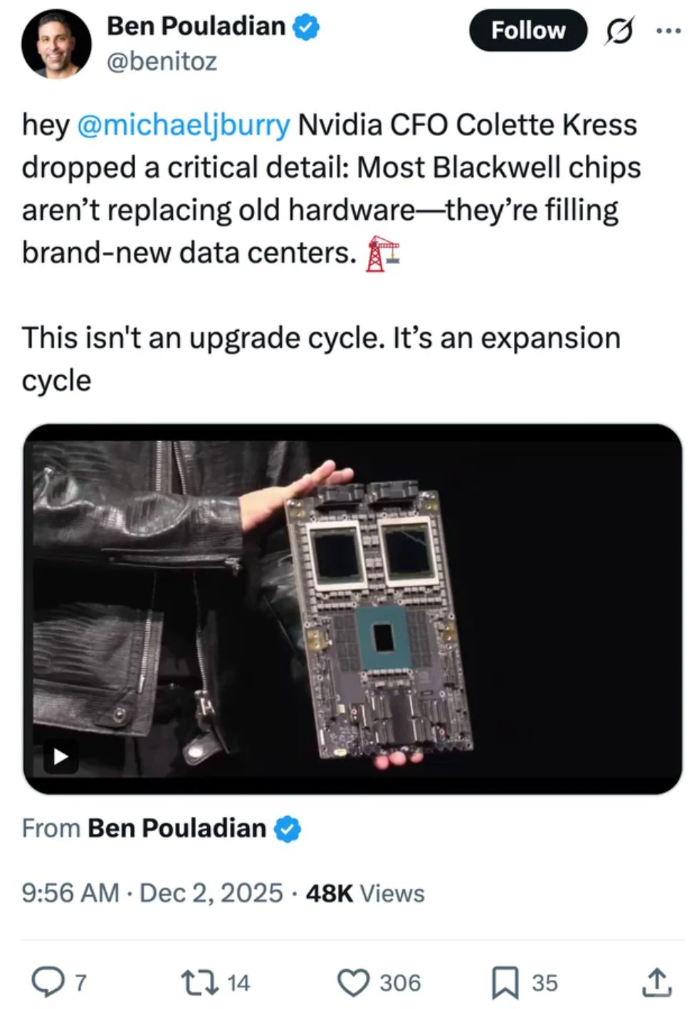 英伟达 CFO Colette Kress 透露了一个被很多人忽略的关键信号:大部分 Blackwell 芯片根本不是用来替换旧GPU 的,而是直接装进全新建设的数据中心里。这说明现在的 AI 还没进入“存量换代”,而是处在越建越多的疯狂扩容期。市场想象中的升级周期根本没开始,算力需求仍在往上狂飙。AI 基建的真正高潮,还远远没到。