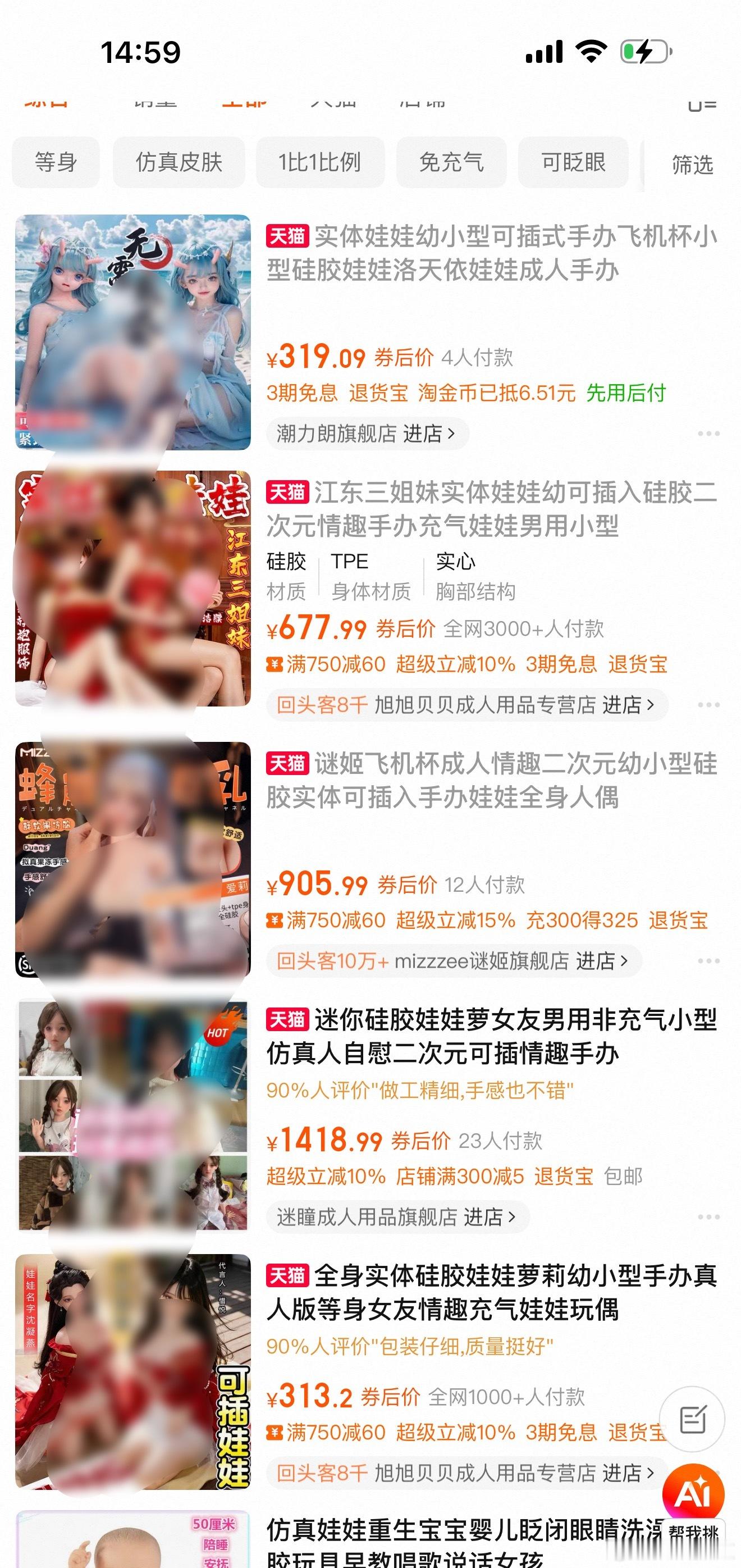 情趣娃娃厂商报价表惊现孕妇体型看了下某宝,有打着情趣手办的名义来卖幼型娃娃的,其功能和成人类的差不多,不过还得找偏门用词才能搜到。情趣品可以制可以买,但是不能拿未成年人幼童当噱头当模版。此外不知道大家有没有发现,现在小孩子的衣服越来越成熟化,成年人的衣服越来越幼稚化,这个世界已经颠了。