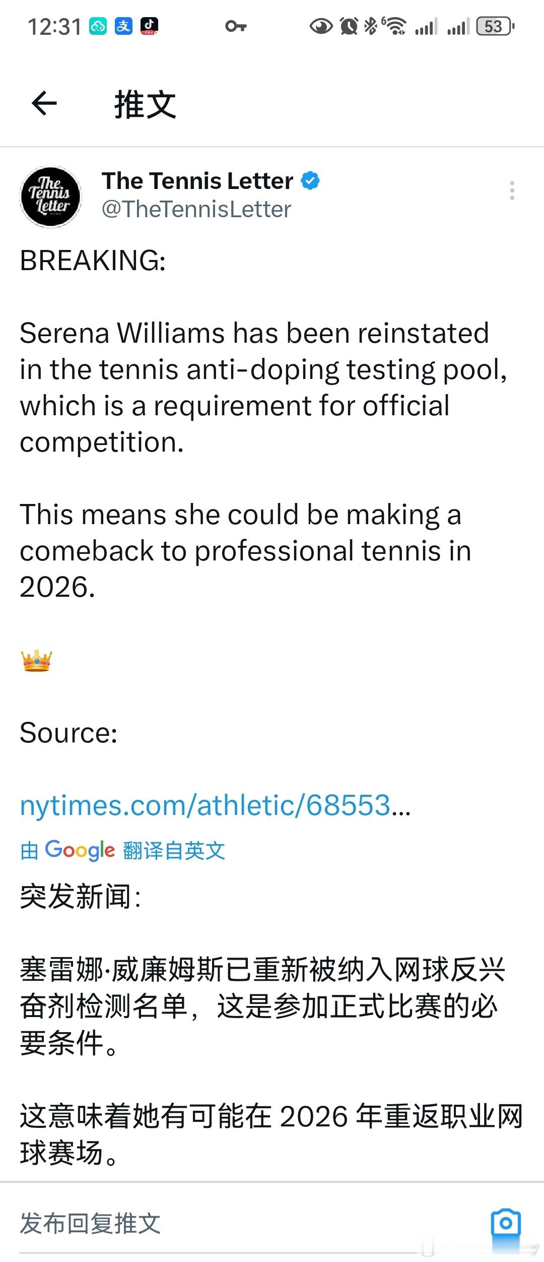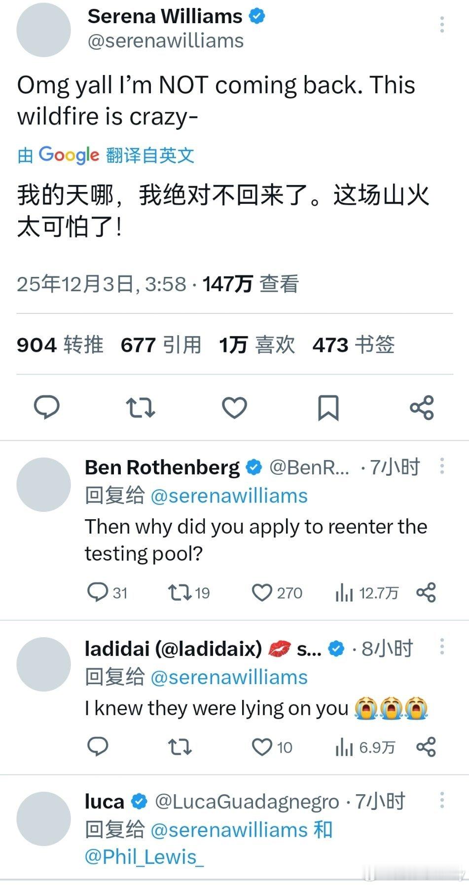 威后出现在反兴奋剂检测名单上而引发复出猜测,不过本人亲自辟谣:不会复出😃。小威发推说:“哎呀各位,我真的不回去了。这场野火太离谱了”。哈哈哈哈哈哈哈。网球小威廉姆斯