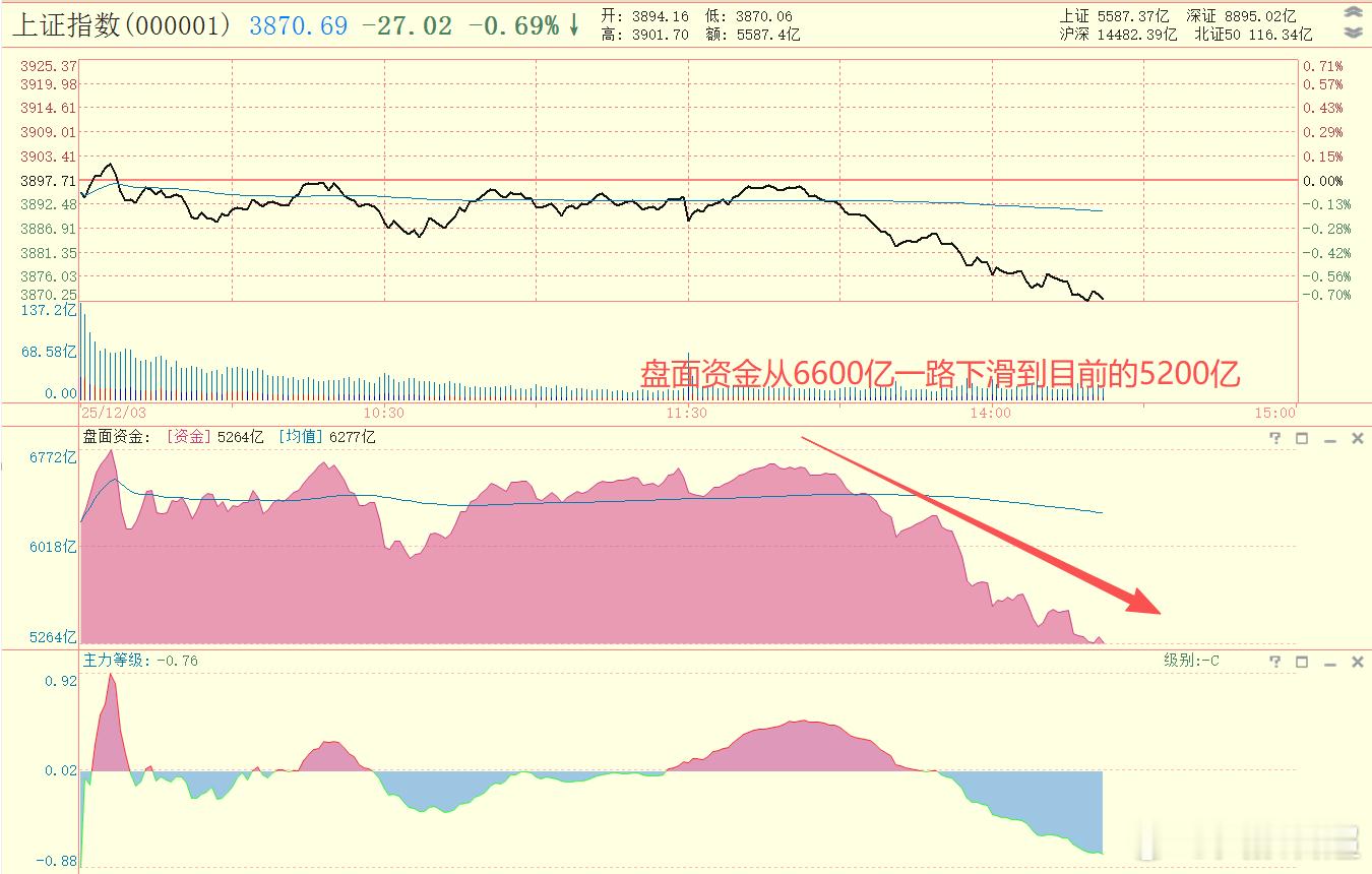 早盘看着分时指标平平无奇,更像是窄幅震荡走势。但下午“基因突变”了,盘面资金下滑了1400亿左右了,下滑幅度比较大。