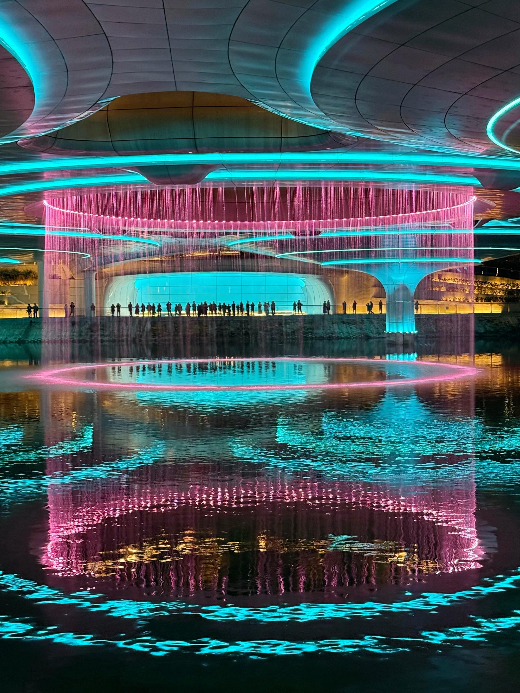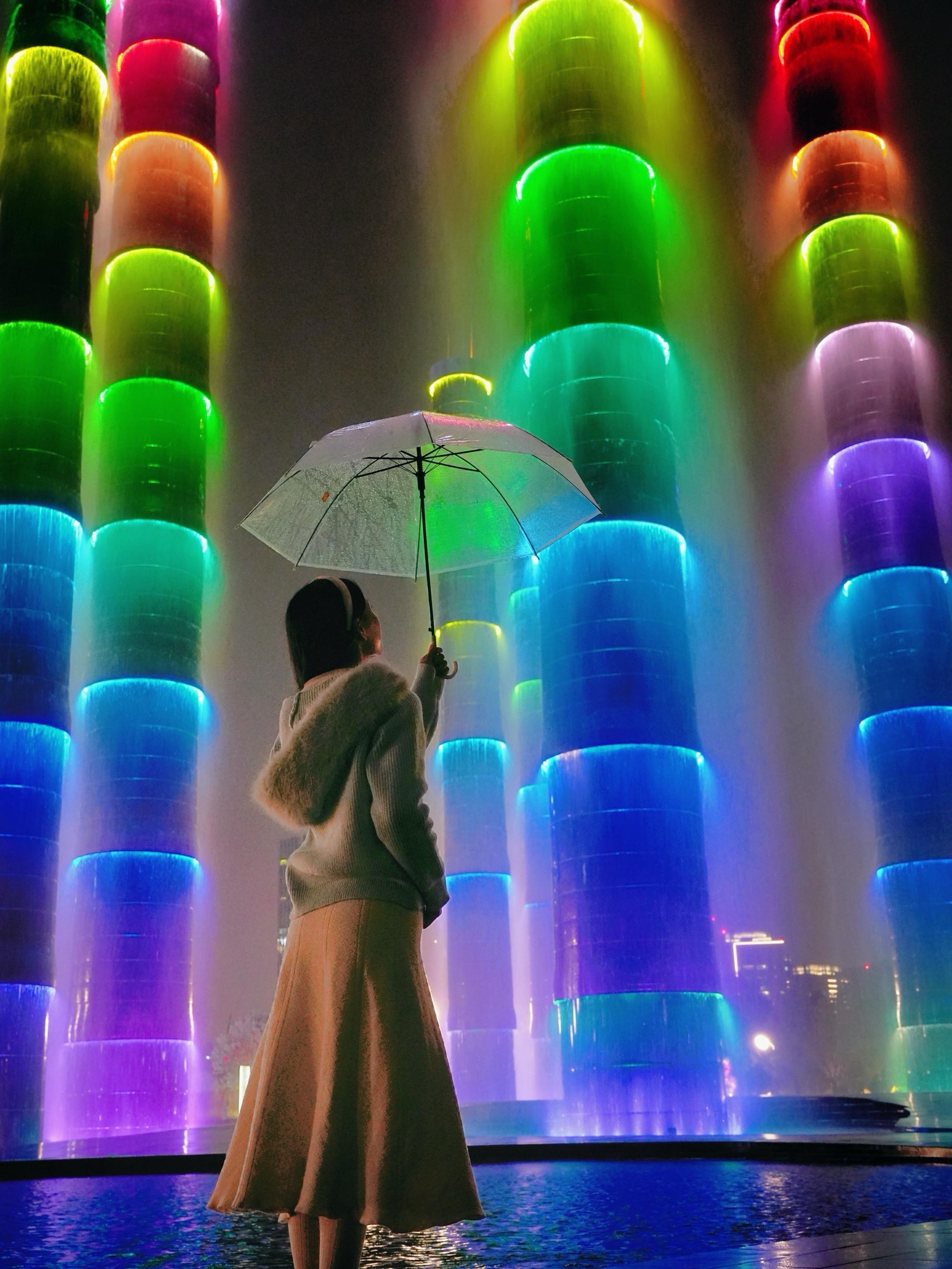 夜晚的灯光秀堪称视觉盛宴,“大熊猫、川剧变脸、我爱成都”等特色图案轮番上演,点亮城南夜空