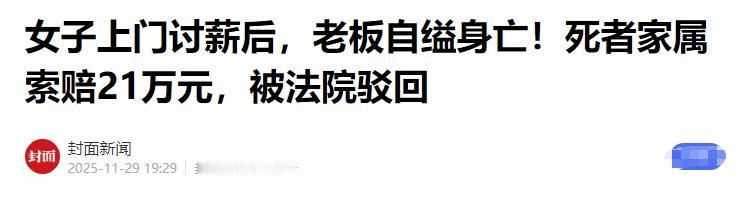 湖南永州,一女子到老板家中追讨欠5年前欠下的工资,与老板夫妻发生争吵,不料,第二天老板自缢身亡,家属将女子告上法庭索赔21万,法院这样判了! 事情发生在今年3月2日晚上,况女士在征得老板李先生的同意后才来到了他家里讨薪。 当时两人在电话里协商一致,李先生说到了会具体计算金额,然后结清。 况女士也充满了期待,因为这笔钱李先生已经欠了5年多了,如果不是家里真的急需用钱度日,她也不会催的太急。 况女士是在2017年到的李先生的公司上班,前几年生意好的时候李先生一直按时发放,为人也十分随和,况女士还觉得自己找了个好公司。 不料,2020年公司发展遇到危机,从这开始就不断欠薪了,况女士也在去年就从公司辞了职。 现在,况女士也不想别的,利息她都不要了,只要能把2万多欠薪还上,一切都一笔勾销,在她看来,李先生好歹也是个老板,不至于2万多都拿不出来。 可结果却让她始料未及,到了之后,李先生却还是说需要缓一段时间,李先生的妻子也说没钱,双方就发生了激烈争吵。 况女士报了警,在警方的协调下,李先生这才同意限期还清欠薪,况女士也没再多说,当晚就返回了住处。 然而,就在第二天,李先生直接在自家厂房上吊身亡了。 李先生家属觉得这是受到了况女士的刺激,于是直接将况女士告上了法庭,要求其赔偿各项损失21万余元,况女士也是有苦说不出,明明她才是受害者,现在却要倒赔钱,她也无法接受。 好在,法院经过审理认定,李先生作为成年人应当对自己的行为和后果做出判断,自杀和况女士讨薪之间不存在必然因果关系,最终驳回了李先生家属的全部诉求。 至于况女士的薪资问题,则不在此案的讨论范围之内,李先生虽然身亡,但他的欠款依然存在,况女士仍可以通过法律途径继续索要薪资。 只是,经过这件事后 ,况女士恐怕也会产生心理阴影了,这2万多欠薪也不知还会不会去要。 值得一提的是,李先生名下有车有房,虽然生意不好做,但基本的生活还是有保障的,也不知他为何因为区区两万元就选择自杀,只能说这也是咎由自取,毕竟欠薪本就不对。 对此,大家又是怎么看的呢?