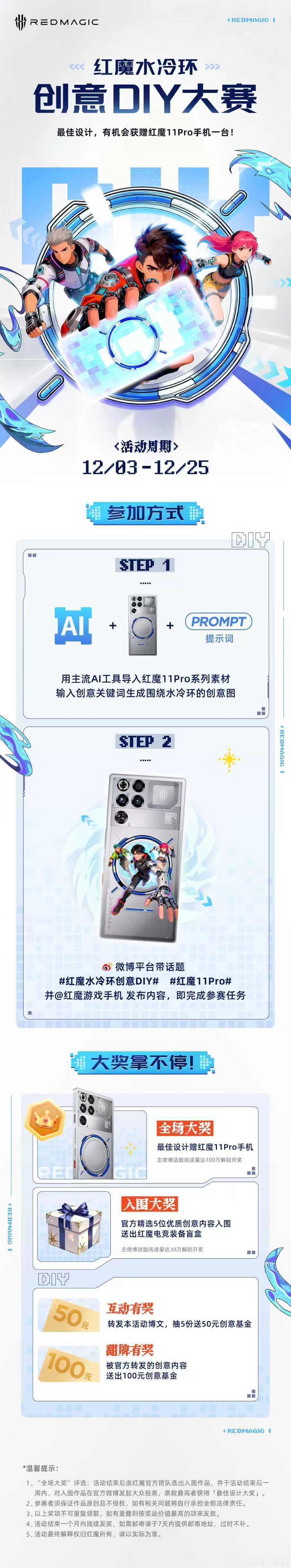 风生水起·创意无限红魔今日开启红魔水冷环·创意DIY大赛,大家可去红魔官方自取素材,通过AI或者P图工具自制水冷环手机壳,把自己喜欢的内容搬到水冷环上。参与活动还有机会获得红魔11Pro手机、红魔电竞装备、大额京东卡等众多好礼,期待看到大家的无限脑洞。红魔