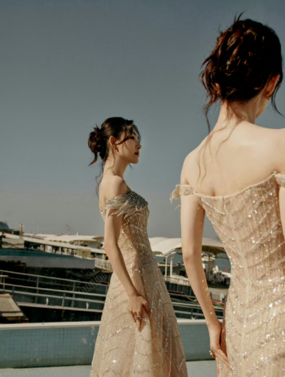 王丽坤这身裸金长裙好美呀,抹胸加一字肩刚好露出好看的肩颈,闪片随动作晃动,灯光下整个人都在发光