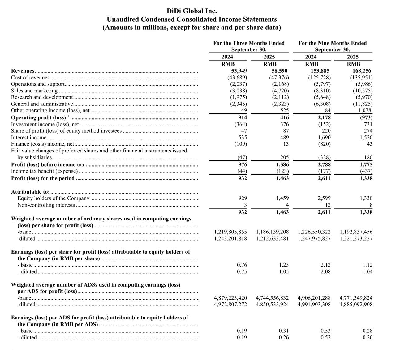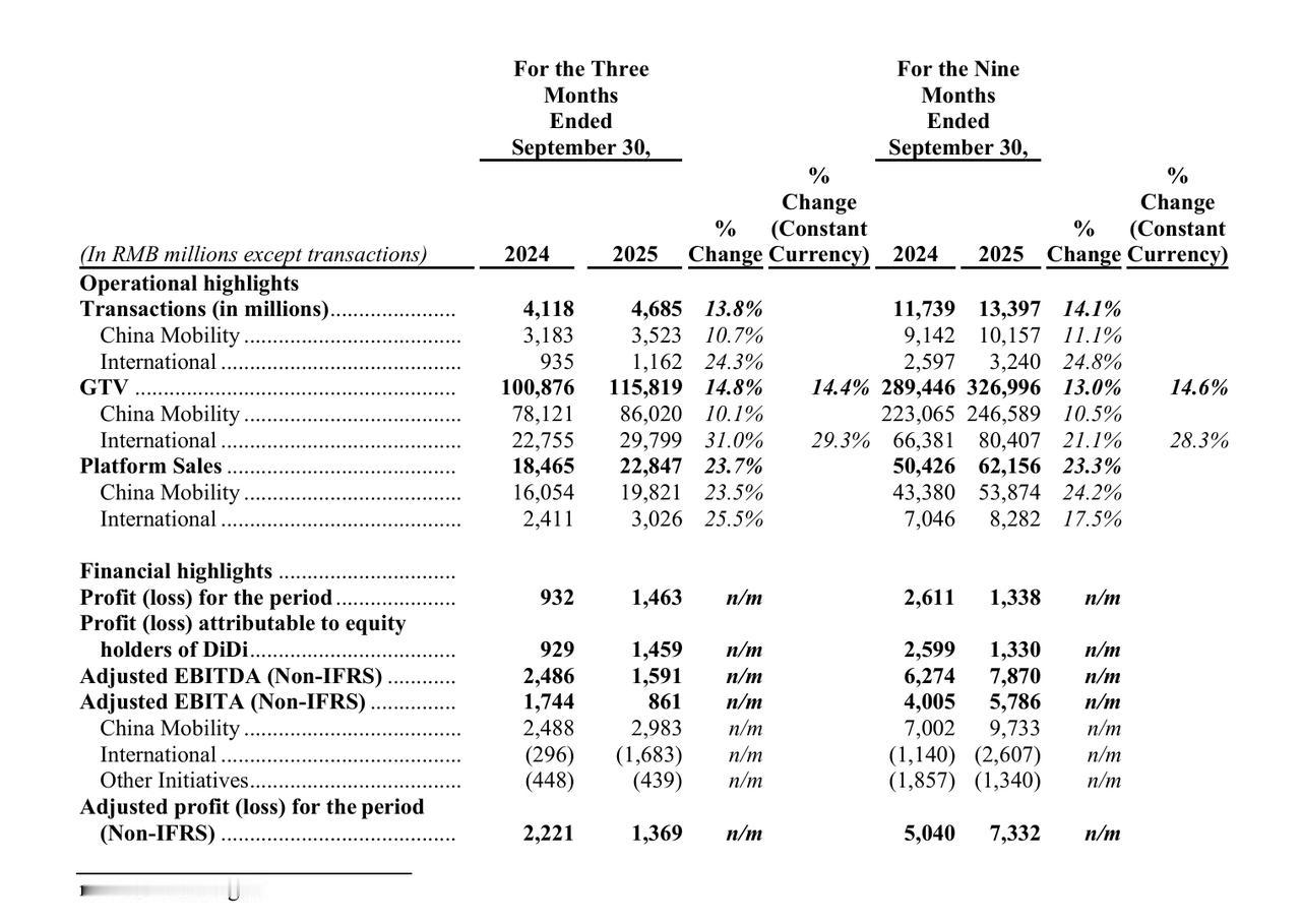 滴滴2025年Q3营收586亿元,净利润15亿元 核心平台交易量达46.85亿笔,同比增长13.8%。中国出行板块交易量达35.23亿笔,同比增长10.7%。国际业务板块交易量达11.62亿笔,同比增长24.3%。核心平台总交易额达1158亿元,同比增长14.8%,按固定汇率计算增长14.4%。中国出行板块GTV达860亿元,同比增长10.1%。国际业务板块GTV达298亿元,同比增长31.0%,按固定汇率计算增长29.3%。 收入增至586亿元,同比增长8.6%,主要得益于核心平台总交易额(GTV)增长。 2025年Q3,中国出行和国际业务板块的平台销售额达228亿元,同比增长23.7%。中国出行板块的平台销售额达198亿元,同比增长23.5%。国际业务板块的平台销售额达30亿元,同比增长25.5%。 收入成本增至474亿元,同比增长8.4%,主要由交易相关成本增加驱动,而交易相关成本增加主要由核心平台交易量增加驱动。 运营及支持费用增至22亿元,同比增长6.4%,主要因司机运营费用增加。销售及营销费用增至47亿元,同比增长55.4%,主要因营销费用和消费者激励措施增加。研发费用增至21亿元,同比增长6.9%,主要因人员相关费用增加。一般及行政费用为23亿元,与去年同期持平。期间利润为15亿元,去年同期利润为9亿元。 归属于滴滴股东的利润为15亿元,去年同期利润为9亿元。调整后息税折旧摊销前利润盈利16亿元,去年同期利润为25亿元。调整后息税及摊销前利润盈利9亿元,去年同期利润为17亿元。 调整后净利润(非国际财务报告准则):2025年Q3调整后净利润为14亿元,去年同期利润为22亿元。截至2025年9月30日,现金及现金等价物和短期投资总额为593亿元。