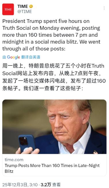 美国媒体今天(北京时间12月3日)报道:“当地时间周一晚上,特朗普总统花了五个小时在真相社交TruthSocial网站上发布内容,从晚上7点到午夜,发起了一场社交媒体闪电战,发布了超过160条帖子。” 当地时间周一晚上7点到午夜,78岁的特朗普在自己创立的“真相社交”(TruthSocial)上没歇着,五个小时里刷出了超过160条帖子,平均不到两分钟就有一条新内容,算得上一场实打实的社交媒体闪电战。 熟悉他的人对这场景不算意外,这位曾经的地产大亨、真人秀主持人,现在的美国总统,早就把社交媒体当成了最顺手的工具。 2024年大选时,他就靠线上“空战”打遍对手,身边还围着本・夏皮罗这样的千万粉丝网红帮他造势,把“经济”“通胀”这些关键词变成选民耳边的高频词。 而TruthSocial本身就是他的重要阵地,虽然比起当年推特的7950万粉丝,这里391万关注者不算多,但却是他能直接发声、不受平台限制的“自留地”。 这次深夜发帖显然不是心血来潮,前一天他刚对结束乌克兰危机表过乐观态度,说美乌会谈有“良好机会”,而就在发帖当天,他还提到要对涉嫌走私毒品的国家动手,连国防部长都得向他解释打击行动的细节。 这些近期的政务动态,大概率都藏在那160条帖子里。 要知道,他早就有类似操作,去年4月“封口费”案开庭时,他就在这平台上连发几十条帖,一会儿吹捧自己一会儿抱怨案件。 说白了,这更像他的一种执政习惯。比起传统政客的新闻发布会,他更爱用短句和快节奏发帖来引导舆论。 之前想提名劳工统计局局长、要放松环境审批,都是先在TruthSocial上放话。 而且他很懂怎么抓眼球,哪怕是联合国扶梯停了、肖像画不合心意这种事,也会立刻发帖造势,这次五个小时的密集输出,显然是想把自己的声音牢牢钉在舆论中心。 不过这背后也有现实考量,TruthSocial其实一直不算景气,2022年亏了5000万,今年上半年又亏2300万,他的高频发帖多少能给平台带点流量。 更关键的是,近期他要推进不少事:美联储主席人选快定了,他属意的哈西特能不能服众还不好说;巴拿马运河的争议也没平息,之前甚至放话不排除动武。 这种时候,用社交媒体快速传递立场、稳住支持者,确实是他最擅长的办法。 这场深夜风暴说到底,是特朗普政治风格的缩影——用最直接的方式抢占话语权,把社交平台变成自己的“扩音器”,至于效果如何,恐怕还要看后续舆论的反应。 以上都是个人观点,对此您有什么不同的看法,可以在评论区留言讨论!!!
