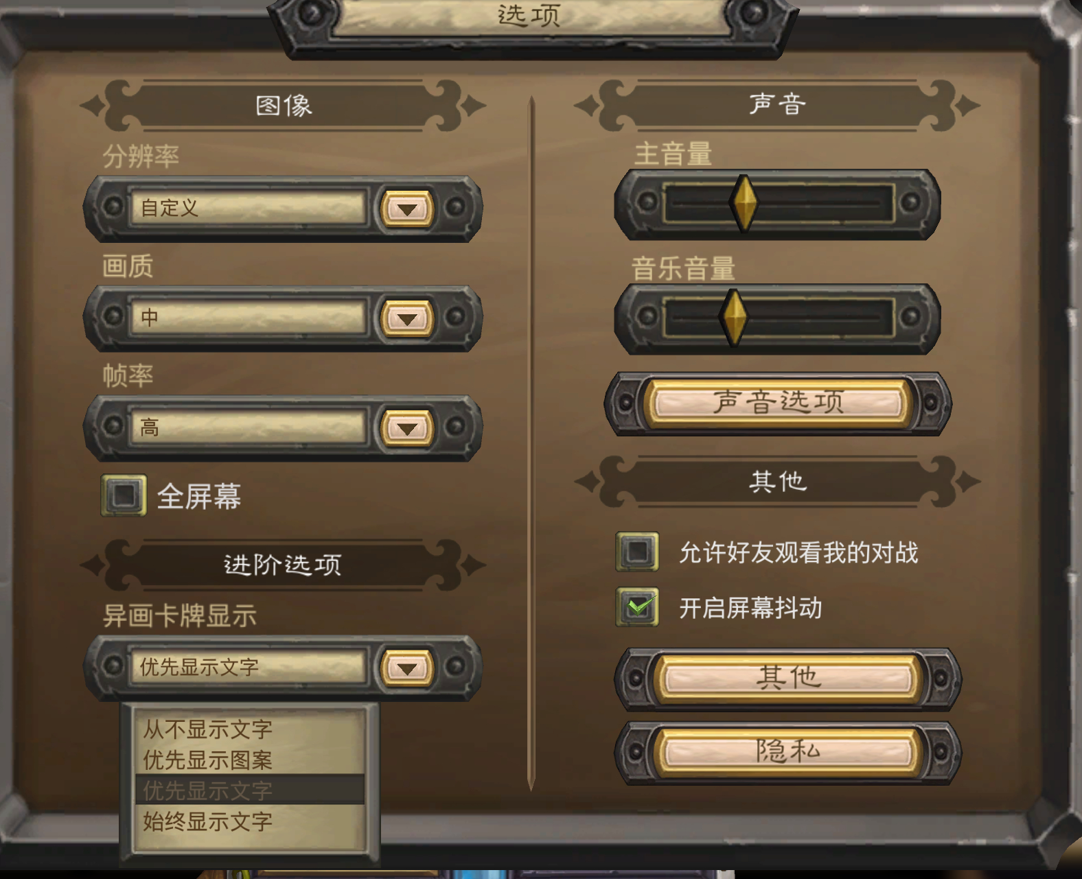 炉石传说 你现在可以自定义异画卡牌上的文字显示方式了。前往“设置”→“选项”,选择你偏好的显示模式:从不显示文字、优先显示图案、优先显示文字(默认)、始终显示文字;你喜欢哪种显示方式?