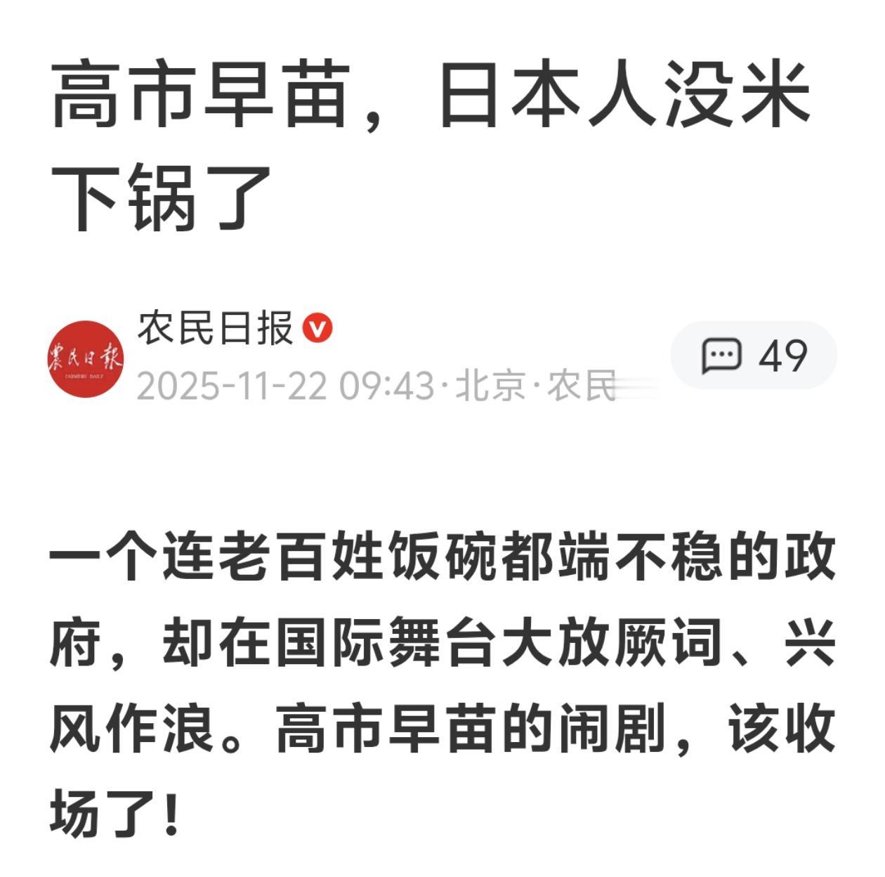 “高市早苗”这个名字,现在看来颇具一些讽刺意味。 “高市”是一个典型的日本姓氏,属于“地名姓”,关于这个姓氏的来历,主流的说法有两种。 一种认为是“高地上的集市”,另一种则认为是“古代高丽人建设的集市”,但不管哪种说法,与“集市”肯定是脱不开关系的。 结合传说中众所周知的日本人姓氏来源习惯来看,他们家祖上还真是不避人呢。在集市上,人来人往的,对吧?[我想静静] 而“早苗”这个名字,在日语语境中其实是“新生的稻苗”的意思,其实寓意也还算美好。 讽刺的是,这个叫做高市早苗的女人,这个“在集市上新生的稻苗”,却使得全日本的民众快要吃不起大米,没米下锅了。 是不是有些讽刺? 不搞事就没有事,不作死就不会死。 她自己实在要搞事,实在要作死,当然也就怪不得别人了。